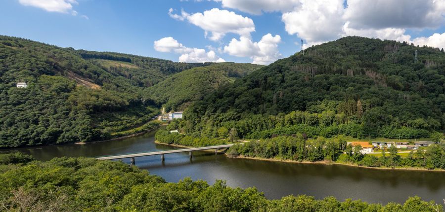 Hier erwartet Wanderer ein fast alpines Erlebnis mit einem beeindruckenden Blick auf das untere Staubecken des Pumpspeicherkraftwerks Vianden und die bewaldeten Ufer der Our. Der Aussichtspunkt befindet sich genau auf der deutsch-luxemburgischen Grenze.