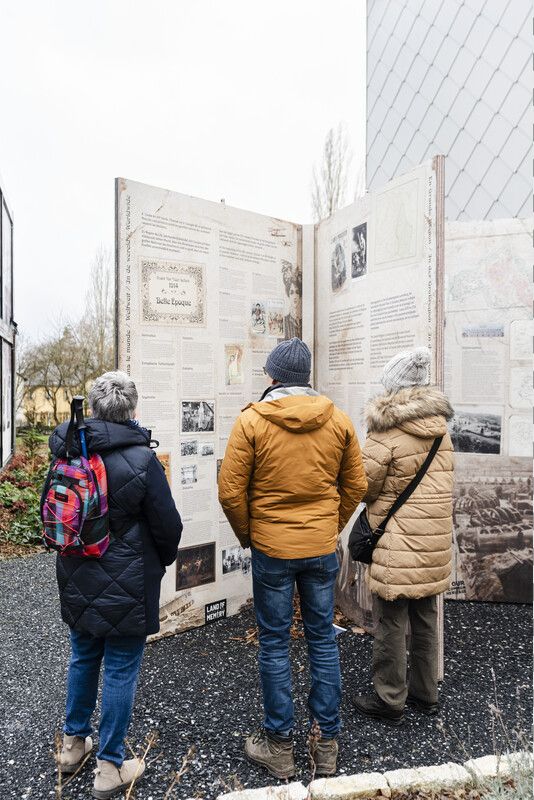 Riesige Fotoalben geben den Besuchern einen internationalen historischen Bezugspunkt, bevor sie das zivile und militärische Leben in der Großregion im Laufe der Jahrzehnte bezeugen und dabei unsere Gemeinsamkeiten und Unterschiede hervorheben.