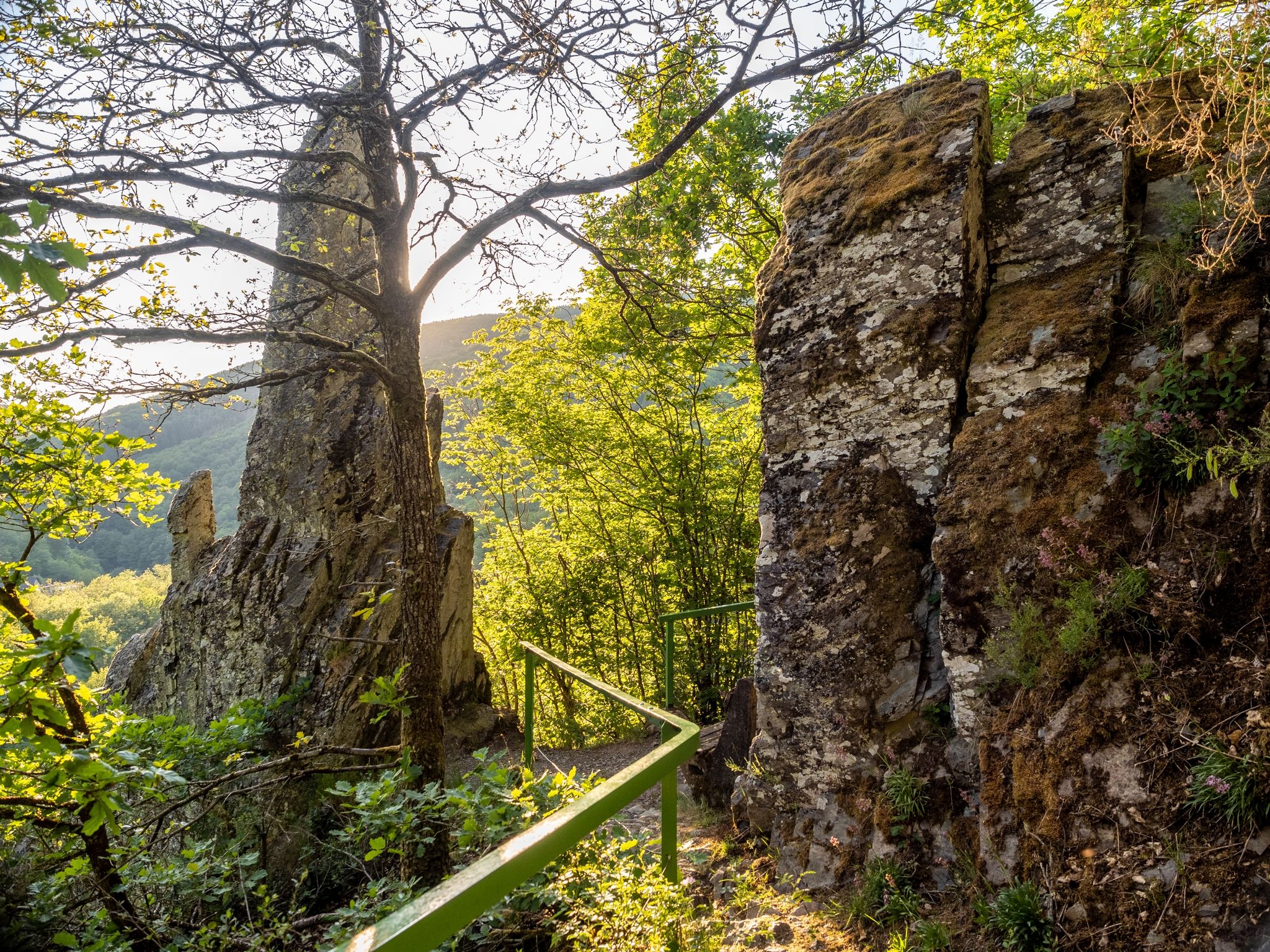 Diese Felsen mit ihren markanten Spitzen werden auf Luxemburgisch auch "Rouschteschleen", rostige Felsen, genannt. Diese außergewöhnliche Anordnung ist eine der faszinierendsten Felsformationen in Luxemburg. Diese kolossale Formation oberhalb von Dirbach ist ein geologisches Wunder, das durch die allmähliche Erosion des Flusses Sûre entstanden ist.