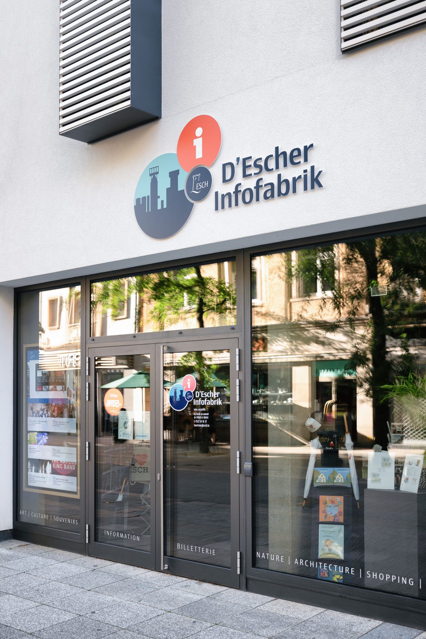 Die Escher Infofabrik ist das Tourismusbüro der Stadt Esch. Sie befindet sich in der Rue de l’Alzette, dem pulsierenden Herzen der Stadt. Sie bietet Besucher*innen und Einheimischen gleichermaßen Informationen und Broschüren zu Unterkünften, Restaurants, Kulturdenkmälern und touristischen Sehenswürdigkeiten sowie ein Verzeichnis der kulturellen Veranstaltungen in ganz Luxemburg, insbesondere aber in Esch und Umgebung. Das Innere des Gebäudes spiegelt die glorreiche industrielle Vergangenheit von Esch mit einer zeitgenössischen Note wider. Hier wird die urbane Kunst durch ein Wandgemälde des luxemburgischen Künstlers Eric Mangen gefeiert.