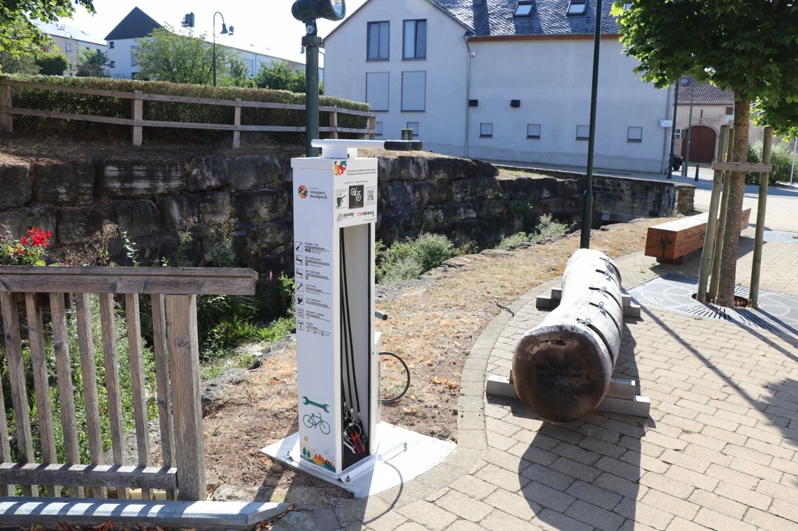 Die Fahrrad-Servicestation gegenüber der Kirche in Mompach bietet Werkzeuge zum Reparieren von Fahrrädern sowie einer Luftpumpe zum Aufpumpen von Rädern wie auch Kinderwagen und Rollstühlen.