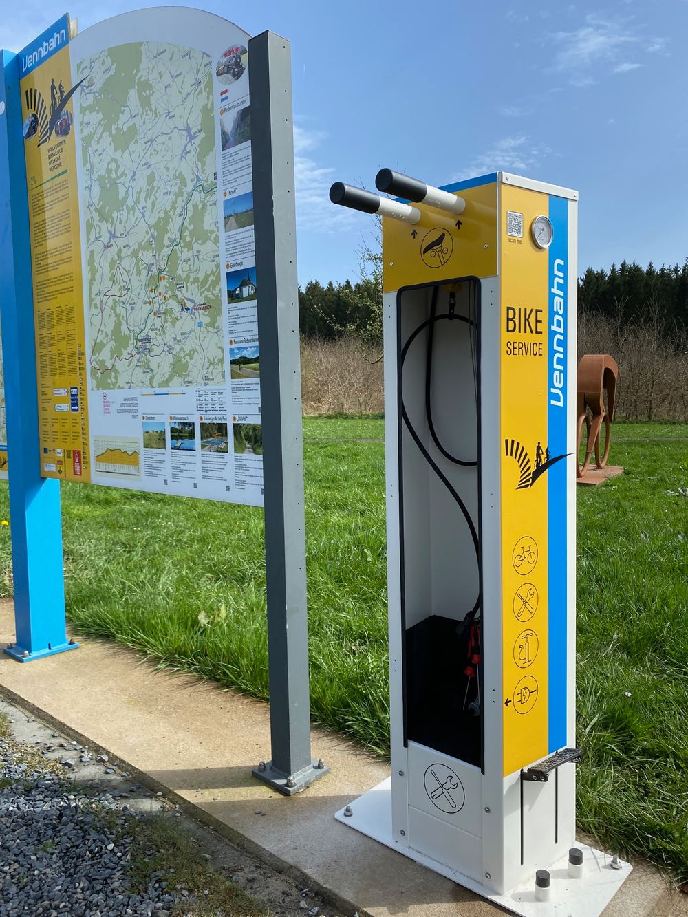 An der Fahrrad-Servicestation finden Sie eine Auswahl an Werkzeugen für Fahrradreparaturen sowie einen Automaten mit Ersatzteilen.