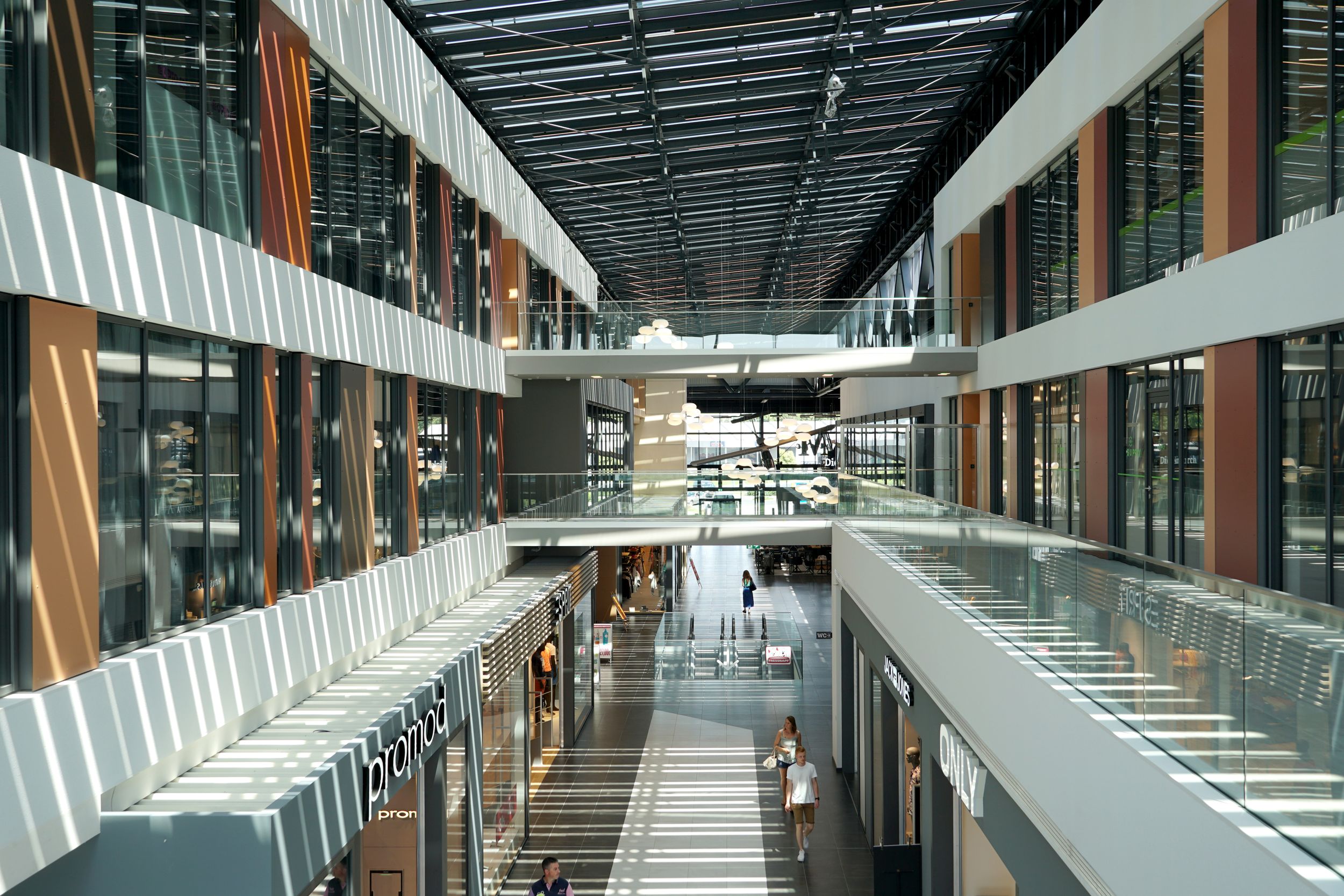 Großes Shoppingcenter in Weiswampach mit vielfältigen Geschäften, Mode, Gastronomie und Cafés.