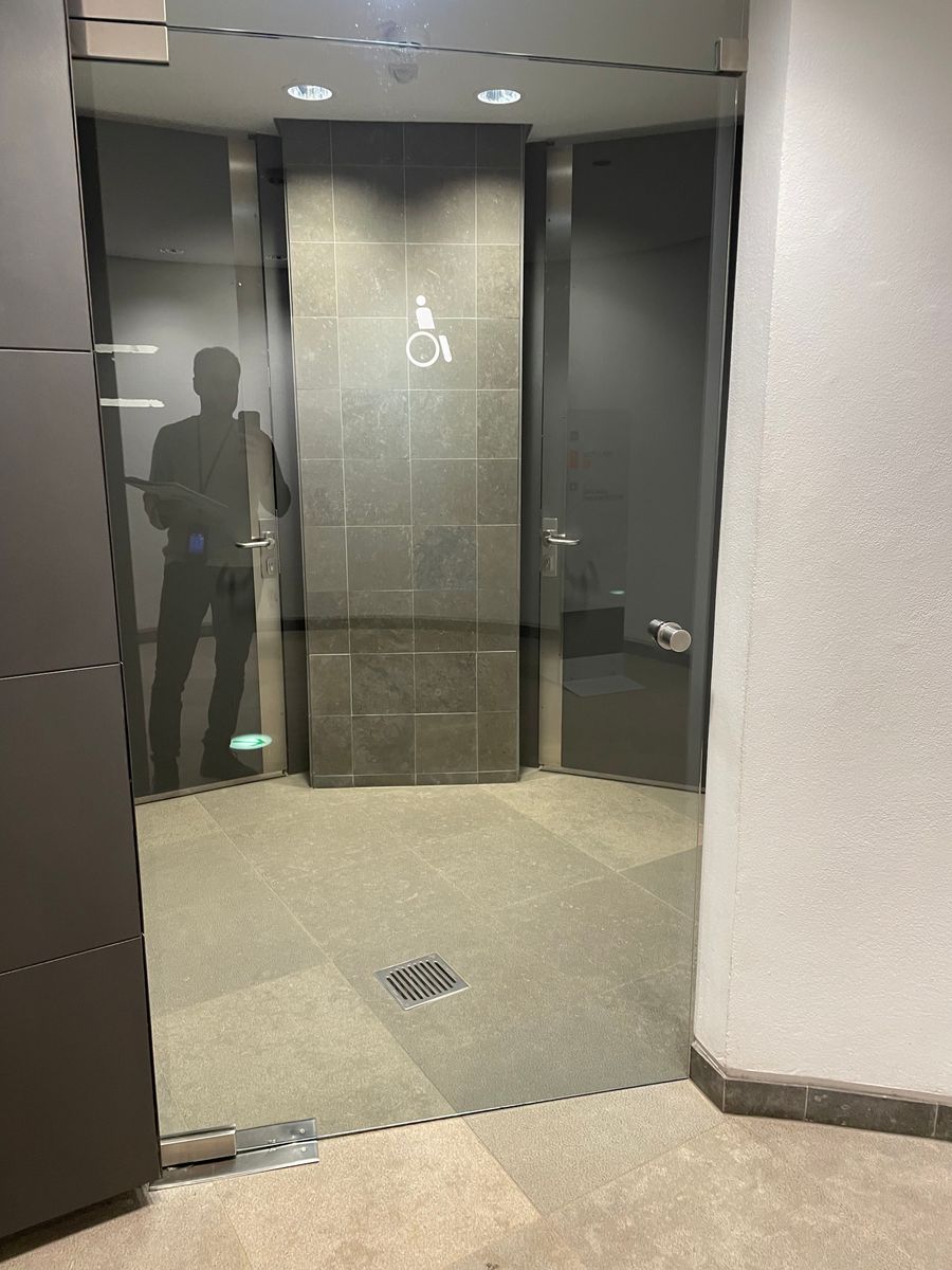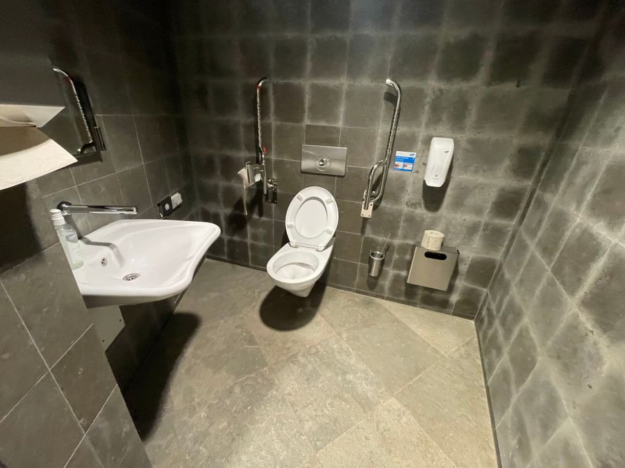 - Es ist ein öffentliches (Behinderten-) WC vorhanden (einseitig anfahrbar)