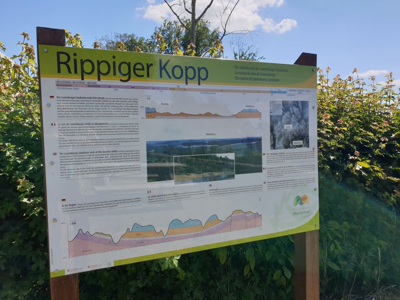 Dieses Geotop liegt sozusagen direkt am Weg – ein Parkplatz an der E29 markiert den Punkt etwas unterhalb des Rippeger Kopps, einer Anhöhe mit Blick über die weite Mergellandschaft im Süden der Region Müllerthal. Das tonhaltige Mergelgestein aus der Zeit des Keupers vor 235 bis knapp 200 Millionen Jahre ist der Sockelbildner der Schichtstufenlandschaft. Ein Sockelbildner ist ein „weicheres“, weniger abtragungsresistentes Gestein, das häufig unter einem „härteren“ liegt.