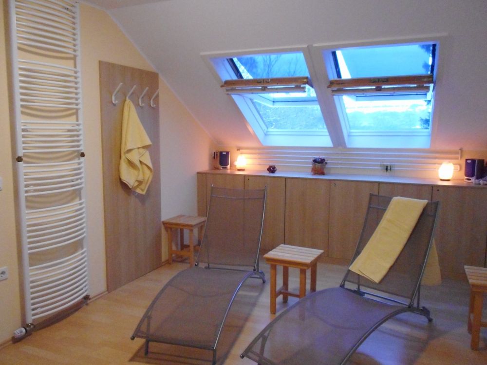 Für Ihre Erholung sorgt unsere Wellness-Oase mit Sauna, Solarium, Infrarotkabine und Ruheraum, die auf Wunsch direkt von Ihrer Wohnung aus zugänglich ist. Im Garten entlang der Wiltz erwartet Sie eine Terrasse, die exklusiv für unsere Gäste zur Verfügung steht. Hier können Sie entspannte Stunden verbringen und bei einem Grillabend (mit Holzkohlegrill) den Tag ausklingen lassen.