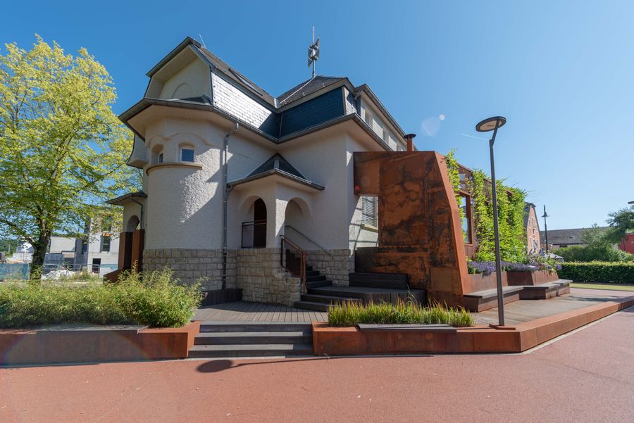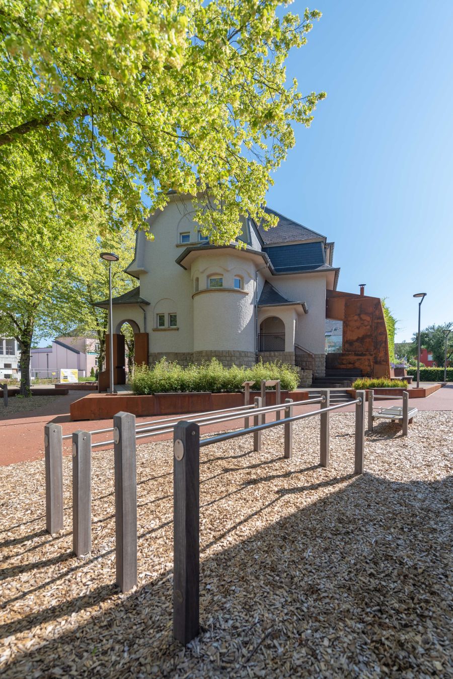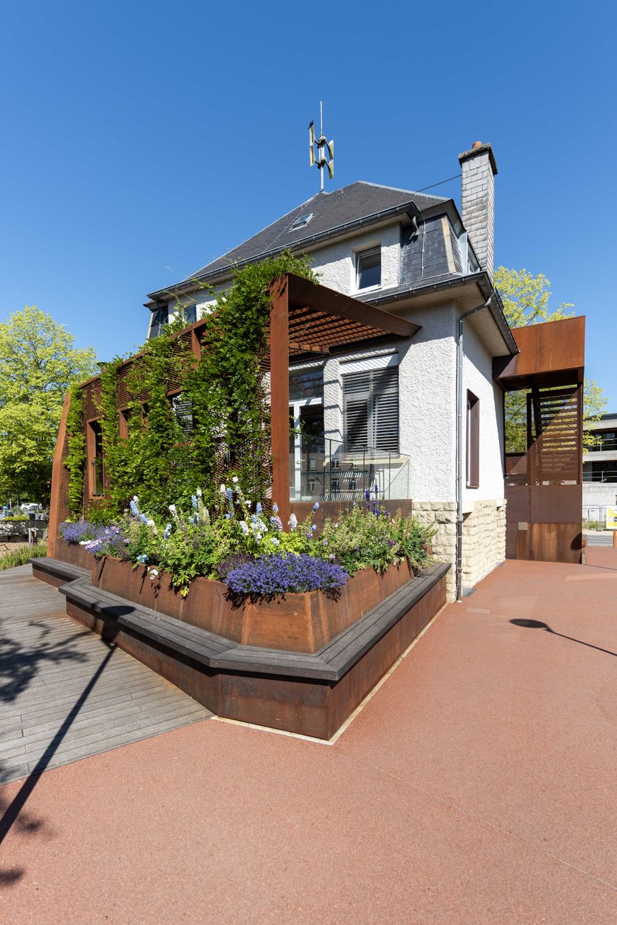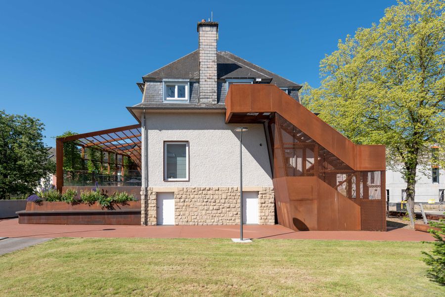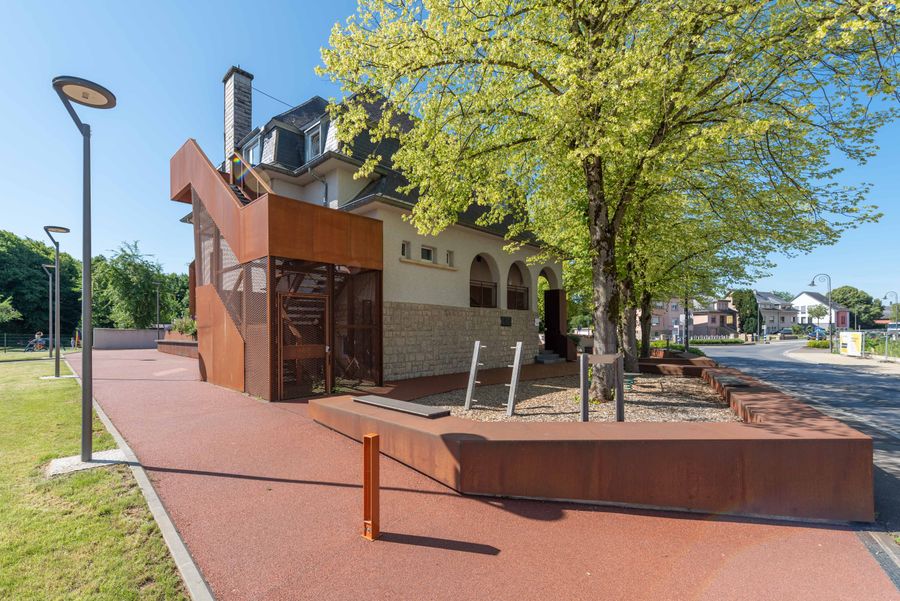 Der neue Zugang von der Hauptverkehrsachse öffnet das "Kabaischen" nach aussen. Der Aussenbereich wurde zudem durch selbstverwitternde Stahlelemente ergänzt, die das "Kabaischen" und die Umgebung optisch aufwerten und weiter in Szene setzen. Diese Stahlkreationen erinnern an den Farbton und die Arbeit der Minett-Stahlindustrie.
