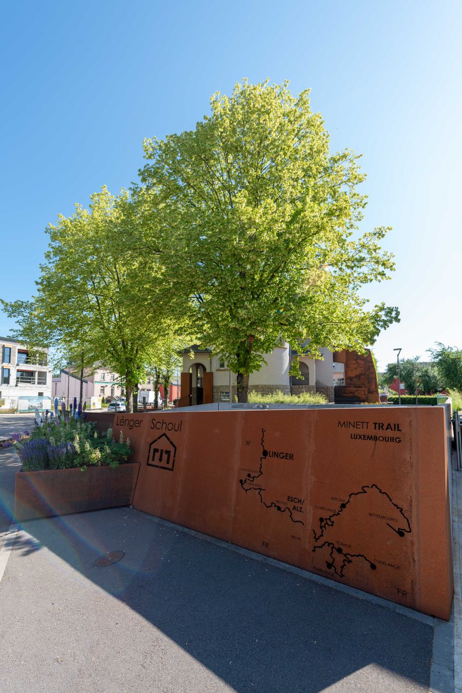 Wie ein Fels in der Brandung stach das Gebäude der alten Linger Schule seit jeher durch ihr massives, unerschütterliches Erscheinungsbild aus dem Rest des Strassenbildes heraus. Diesem markanten Symbolcharakter wollte man bei der neuen Ausarbeitung im Kader des Minett Trails selbstverständlich gerecht werden; deshalb wurde sich bei der Umgestaltung vor allem auf die äusseren Bereiche konzentriert. Dabei wurde stets darauf geachtet, den Bedürfnissen der Gäste und Anwohner zugleich gerecht zu werden.