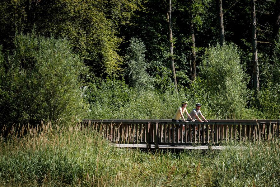 Der Radweg beginnt im Tal des Flusses Weiße Ernz bei Koedange und führt von dort aus nach Norden durch das neu gestaltete Gebiet der Soupe, ein faszinierender Biotop. Über eine kleine Felsenschlucht und zahlreiche Holzbrücken erreicht man Larochette, ein malerisches Städtchen mit seinem schönen Marktplatz "Place Bleech" und der imposanten Burg, die darüber thront. Die Burg ist zu Fuß erreichbar und kann über einen steilen Pfad besichtigt werden. In der Tourist Info in Larochette gibt es viele Informationen, außerdem sind Souvenirs und regionale Produkte erhältlich. Hier steht auch eine Fahrradreparatursäule und ein Trinkbrunnen. Der Radweg führt weiter nach Norden, vorbei an alten Mühlen "Follmillen" und "Uelegsmillen" bis nach Medernach. Von dort verläuft er durch eine Weidenlandschaft weiter nach Ermsdorf, wo der Radweg endet. Eine Erweiterung nach Norden (zum Radweg PC16) und nach Süden (zum Radweg PC2) ist geplant.