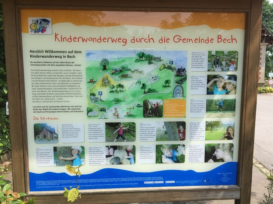 Auf 13 verschiedenen Stationen erkunden die Kinder die 5,5 km lange Gehstrecke. Dabei sind sie den Waldtieren auf der Spur, lernen etwas über Kinderrechte oder erleben „Großmutters Waschmaschine“. Los geht’s am ehemaligen Bahnhof „Becher Gare“ in der Ortschaft Bech bei Echternach. Wer dann noch nicht müde ist, kann sich noch auf dem Spielplatz neben der Becher Gare etwas austoben.