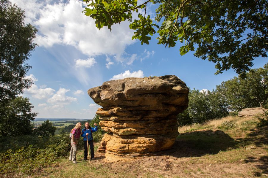Durch Nommern hindurch geht es zu weiteren spektakulären Felsformationen. Sie parken am Eurocamping Nommerlayen, dort folgen sie der Beschilderung des Auto-Pédestre Nommern, um eine Rundwanderung durch die spektakuläre Felsenlandschaft der Noumerleeën zu unternehmen (Länge der Wanderung: 5,3 km). Sie fahren zurück nach Nommern und folgen dann den Schildern nach Angelsberg und dann nach Fischbach. Dort wurde früher in der „Aal Schmelz“ Eisenerz verhüttet. Von Fischbach aus geht es weiter nach Heffingen. Gegenüber der Kirche folgen Sie dem Schild „Kapell am Héikräiz“ und auf der Straße Stenkel weiter nach Süden, wo außerhalb des Ortes am Héikräiz eine schöne Möglichkeit zu einem Picknick mit Aussicht über die hügelige Landschaft besteht.