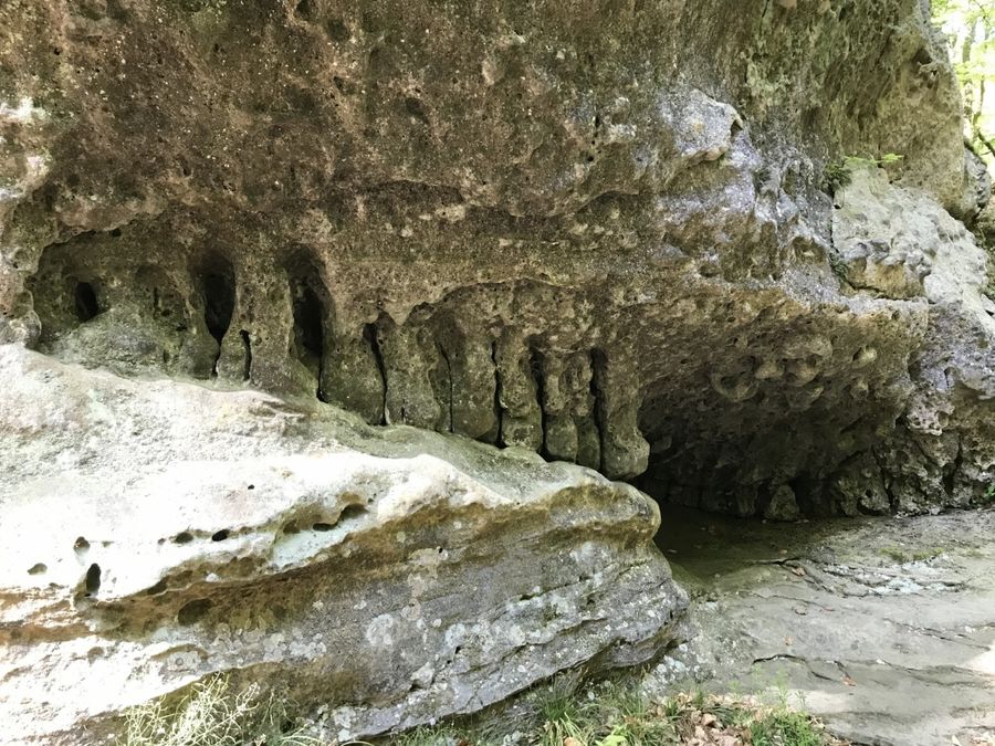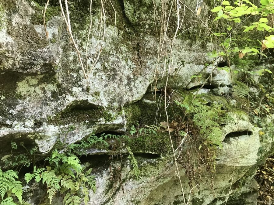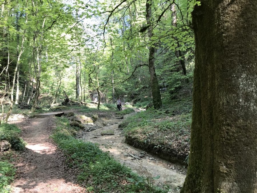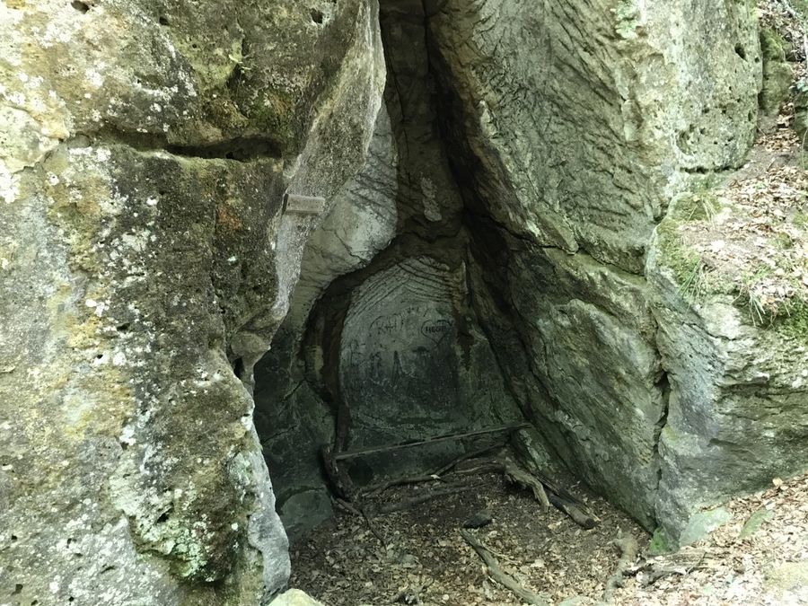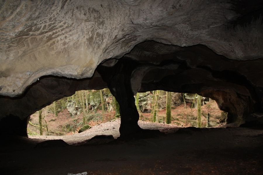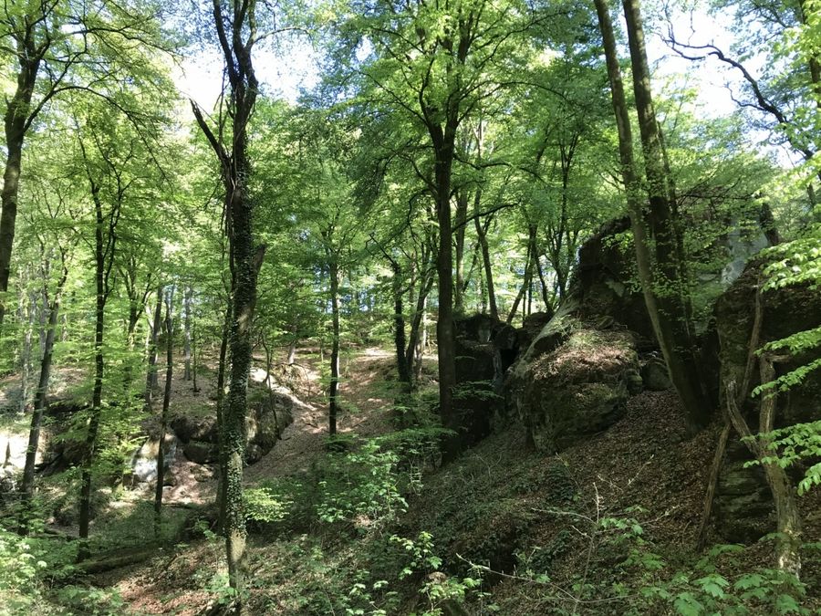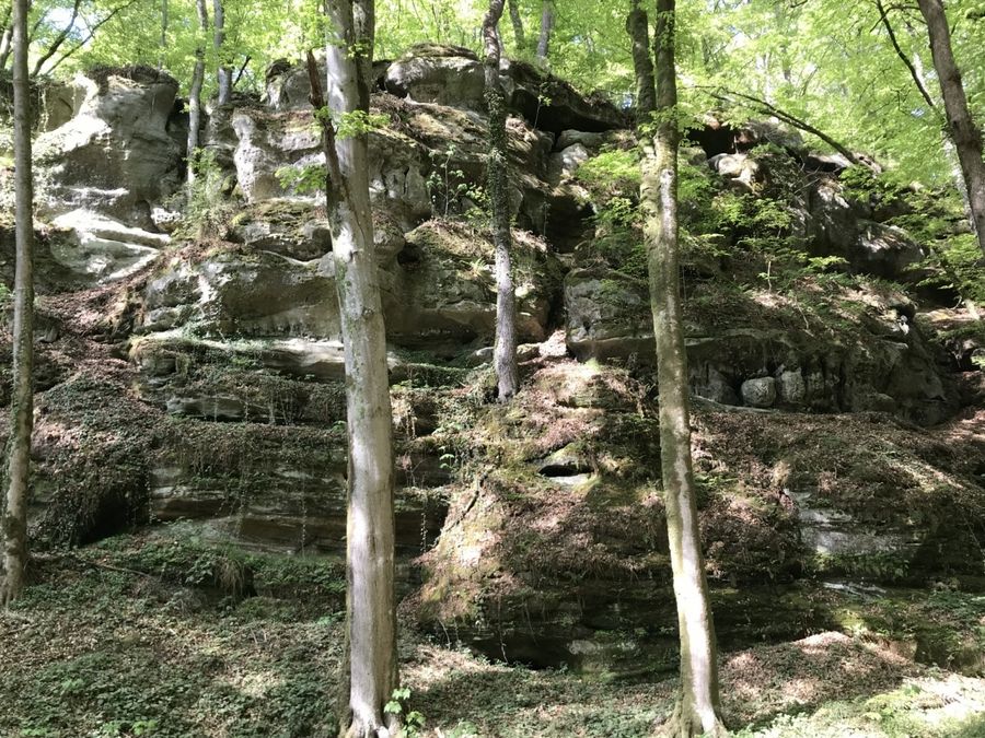 Der Weg verläuft zunächst am Bach entlang und durch die Felsenlandschaft von Berdorf. Die Huel Lee erreichen Sie nur, wenn Sie nach ca. 800 m einen Abstecher (ca. 150 m lang) nach links machen. Die Huel Lee ist eine von Menschenhand geformte Höhle. Dort wurden früher Mühlsteine aus den Felsen herausgebrochen.