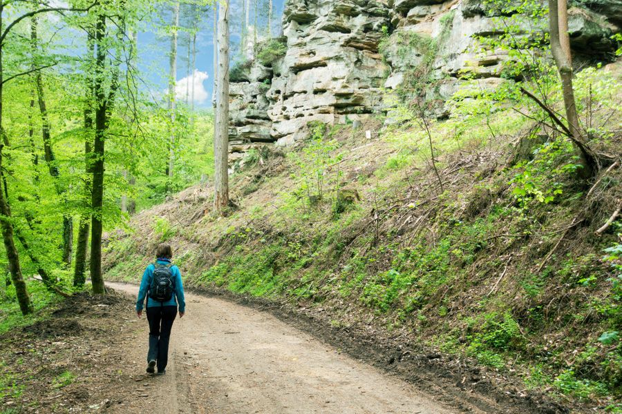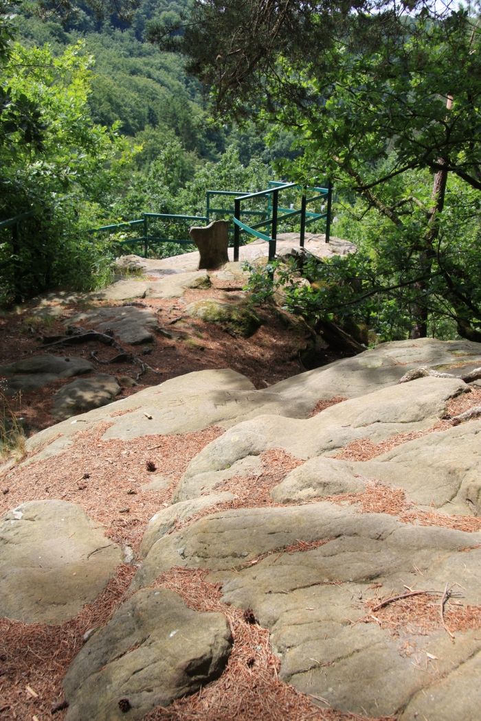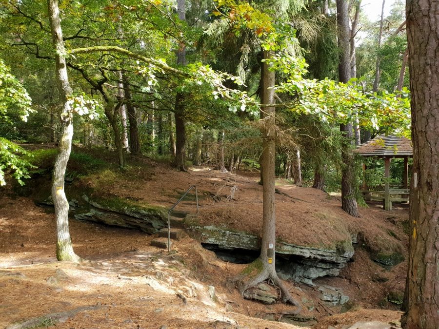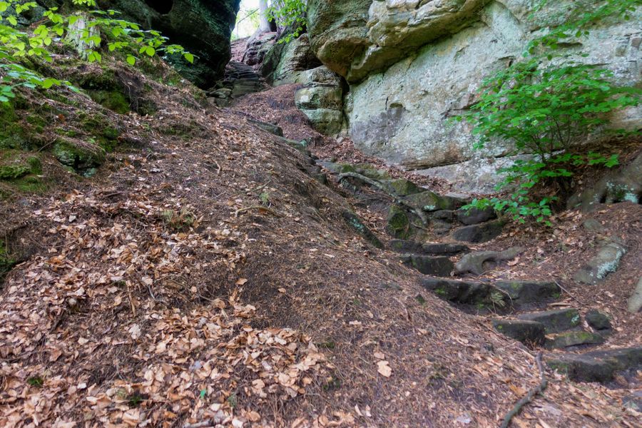 Dieser kleine Rundweg mit viele Pfaden führt zunächst auf etwas kniffligen Stufen durch einen engen Felsspalt hinab ins Tal. Auf der Höhe der Straße ist bereits ungefähr die Mitte des Weges erreicht. Ab hier führt der Weg wieder bergauf, entlang der imposanten Felsenlandschaft und zurück nach Consdorf.