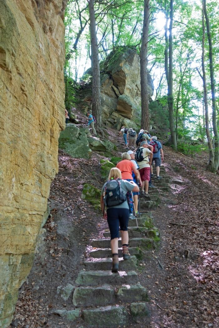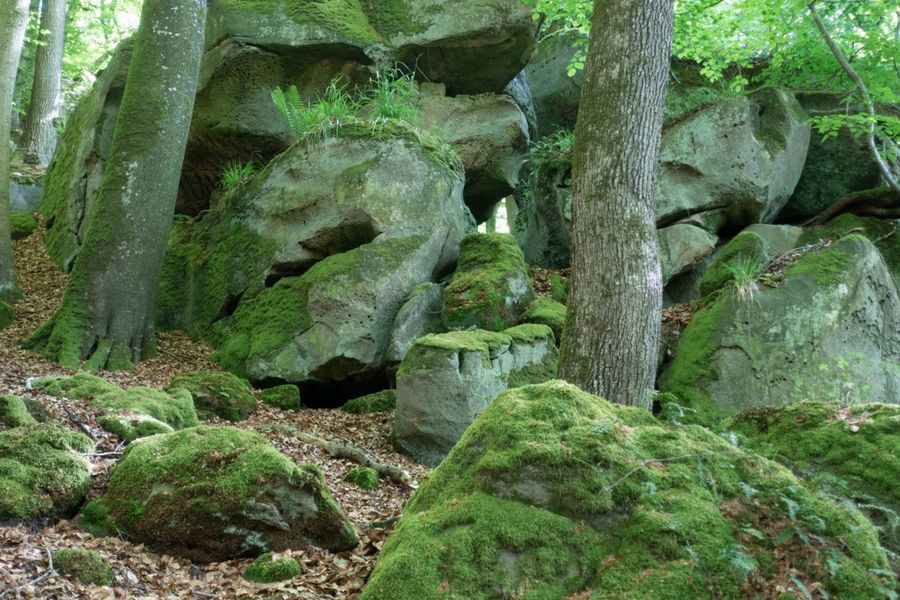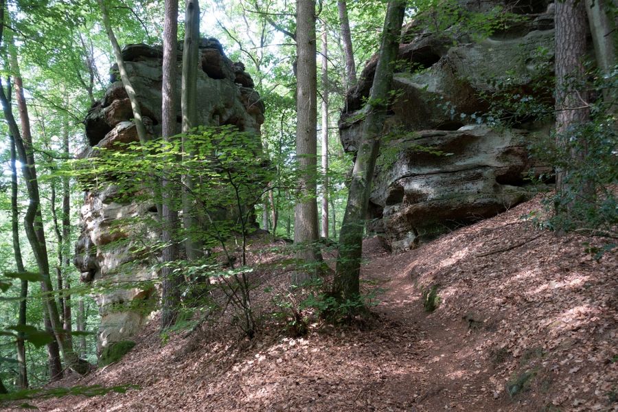 Auf kleinem Raum bietet sich hier ein Highlight nach dem anderen: Mächtige Felsblöcke wie der Päerdskapp (Pferdekopf), kuriose Erosionsformen und klaffende Felsspalten wie die Schelmelee - eine frühere Behausung - beeindrucken auf diesem Wanderweg durch ihre erstaunliche Vielfalt und Erscheinungsform. Der Weg ist aufgrund schmaler Passagen und felsigem Untergrund einer der anspruchsvolleren Wanderwege in Consdorf und führt ausschließlich durch den Wald.