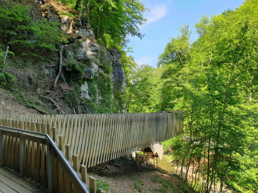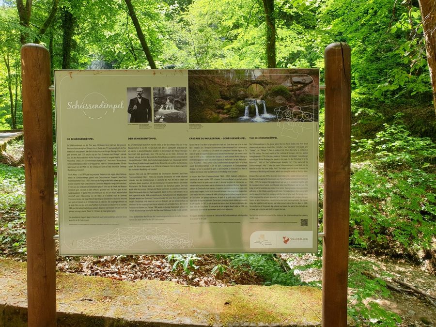 Dieser Wanderweg führt zum Wahrzeichen der Region Müllerthal - Kleine Luxemburger Schweiz: Der Schiessentümpel. Er ist das beliebteste Ausflugsziel in der Region und kann am besten zu Fuß erreicht werden. Hinter dem Schiessentümpel schließt sich eine moderne Treppenkonstruktion an, die erbaut wurde um den Schiessentümpel nach den starken Unwettern 2018 wieder zugänglich zu machen.