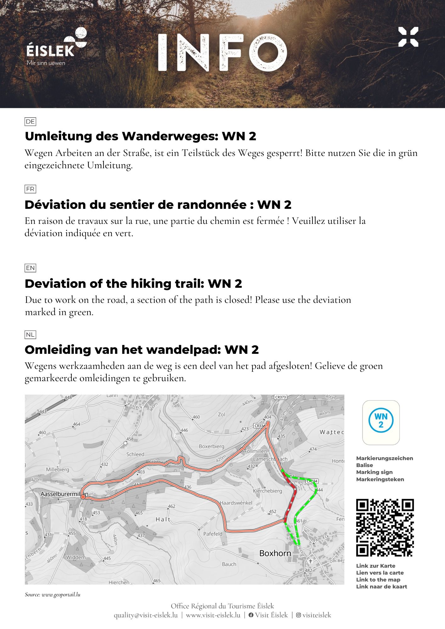 Der Wanderweg ist in beide Gehrichtungen markiert. Bitte folgen Sie den weiß-blauen "WN 2" Markierungszeichen .
