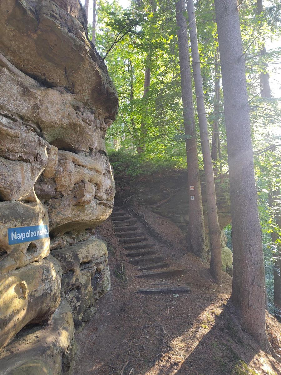 Der Weg führt zunächst über einen asphaltierten Weg in den Wald. Dort schlängelt er sich sanft, von Felsen gesäumt, den Berg hinauf. Über einen Hohlweg erreicht man die Al Schmelz, die einzigen sichtbaren Überreste der alten Schmelzwerke von Fischbach. Weiter geht es über Treppen hinauf zum Napoleonshut. Ein gepflasterter Weg führt anschließend weiter bergauf. Oben angekommen, leitet ein weiterer Hohlweg hinunter ins idyllische Koedange. Auf dem Rückweg führt der Weg erneut durch den Wald, wo schöne Ausblicke auf Fischbach warten.