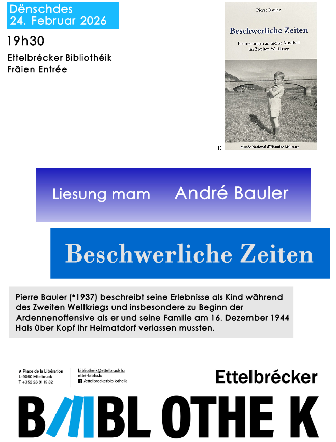 D'Ettelbrécker Bibliothéik invitéiert iech häerzlech op eng Liesung mam André Bauler, dënschdes, de 24.Februar 2026 um 19.30 Auer.