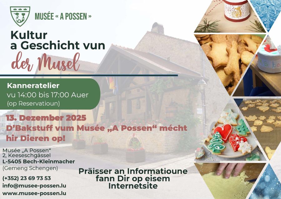 Weihnachten steht vor der Tür, und wisst ihr, was in dieser Zeit unentbehrlich ist? Plätzchen, natürlich! Das Museum « A Possen » lädt daher Kinder im Alter von 6 bis 12 Jahren ein, am 13. Dezember an einem Atelier teilzunehmen. Begleitet von unserer Mediatorin haben sie die Gelegenheit, eine Vielzahl von Plätzchen in verschiedenen Formen und Farben zu backen und zu dekorieren. Und da diese köstlichen Kreationen unbedingt mit nach Hause genommen werden müssen, kann jedes Kind nach dem Backen seine eigene Keksdose gestalten und personalisieren!