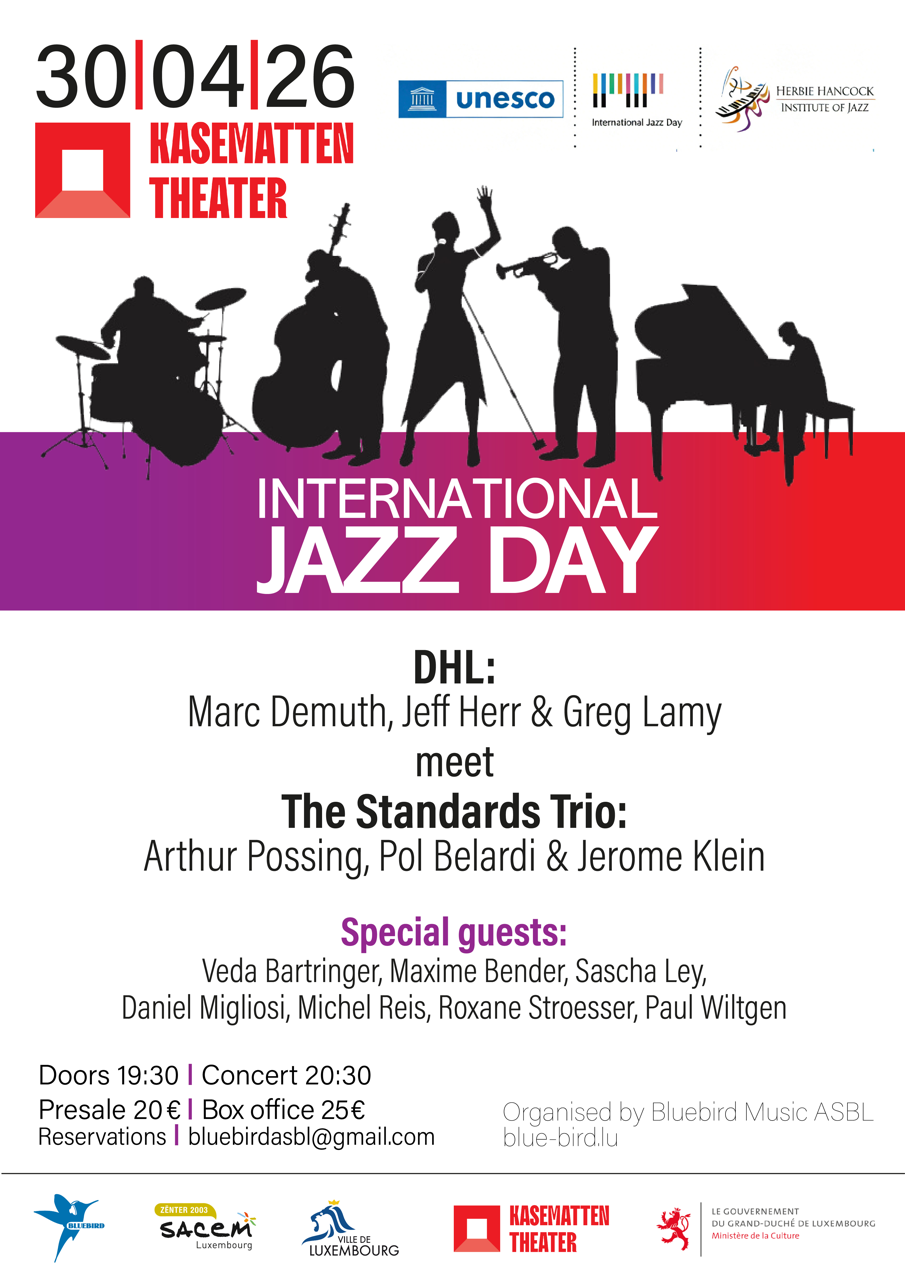 Bluebird Music ASBL freut sich, ein besonderes Programm zum Internationalen Tag des Jazz zu präsentieren, mit renommierten luxemburgischen Jazzkünstlern. Es verspricht einen außergewöhnlichen Abend voller gefühlvoller Improvisationen und lebendiger Melodien. Begleiten Sie uns bei der Feier des zeitlosen Geistes des Jazz und des lokalen Talents in seiner besten Form.