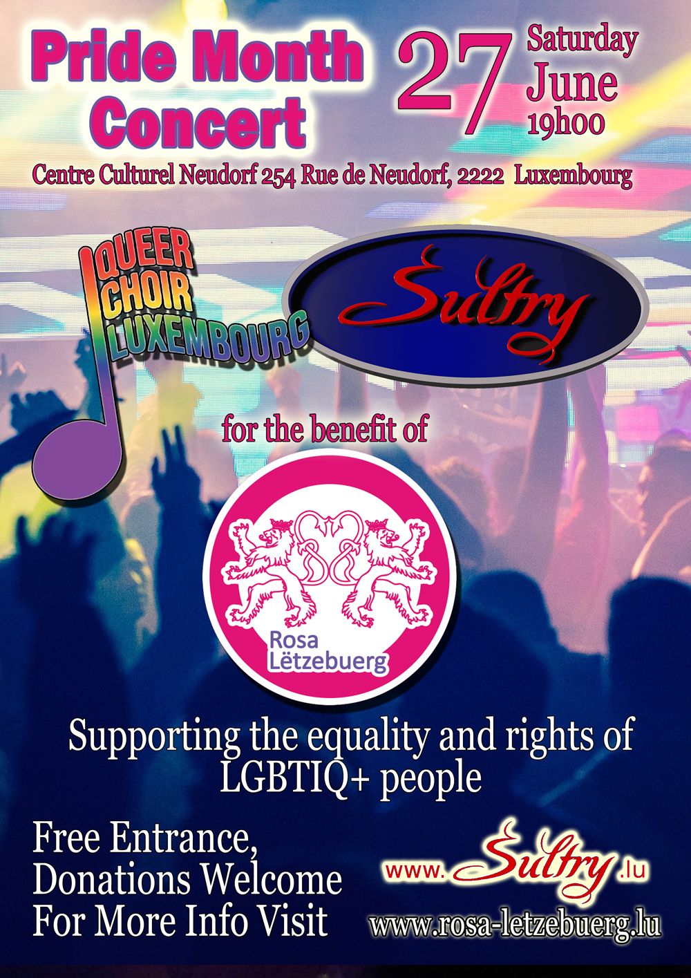 Im Rahmen des Pride Month gibt die Luxemburger A-cappella-Gruppe Sultry gemeinsam mit dem Queer Choir Luxembourg ein fröhliches Benefizkonzert zugunsten von Rosa Lëtzebuerg. Das Konzert findet am Samstag, den 27. Juni 2026, im Centre culturel de Neudorf statt und ist für alle offen. Konzertbeginn ist um 19:00 Uhr, die Bar öffnet bereits um 18:00 Uhr.