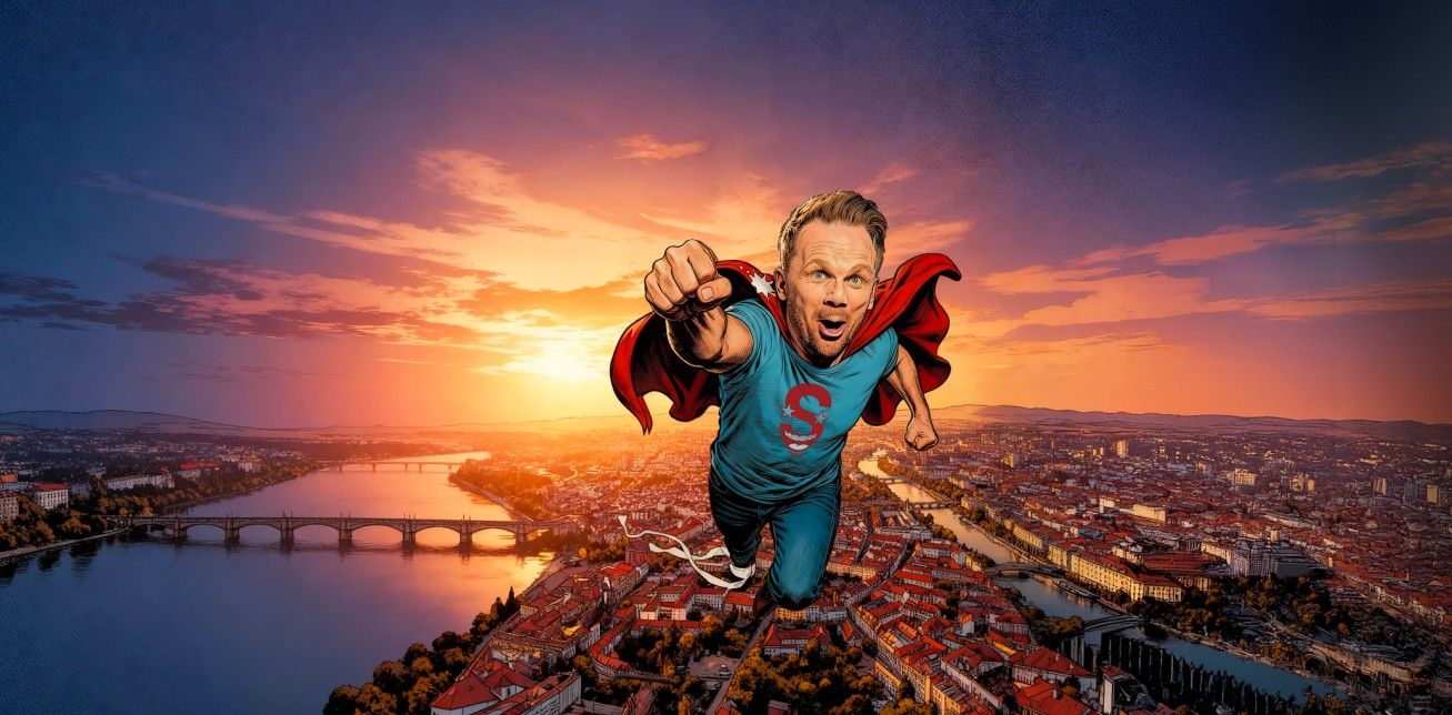Er rast über die Bühne mit der Geschwindigkeit von Flash. Seine Pointen schlagen ein wie der Hammer von Thor. Mit dem Röntgenblick von Superman schaut er den Menschen in die Seele und weiß sofort, was sie wollen – und er gibt ihnen genau das! Mit seiner ultimativen Superkraft: