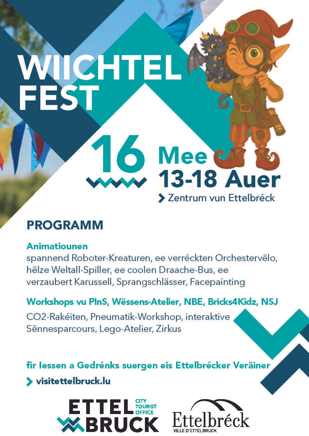 Das Wiichtelfest. ist ein Kinderfest voller Magie, Klang und Kreativität, das am 16. Mai in der Fußgängerzone von Ettelbrück stattfindet. Die Innenstadt verwandelt sich für einen Tag in ein echtes Abenteuerland für kleine und große Besucher.