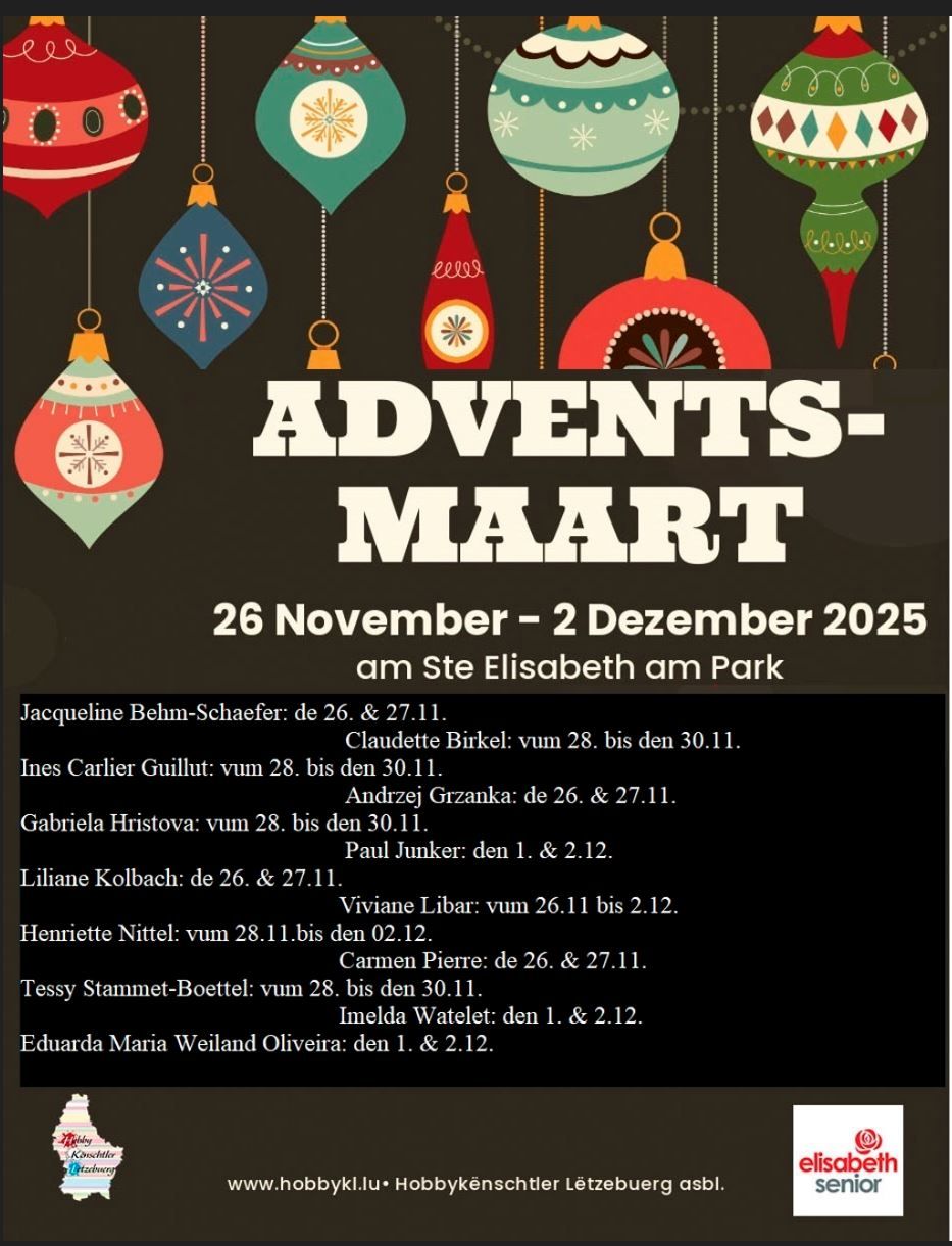 From 26.11. to 02.12. Hobbykënschtler Lëtzebuerg asbl will participate in the Advent Market at the STE ELISABETH AM PARK nursing home, avenue Emile Reuter Luxembourg It is open from 11:00 to 17:00