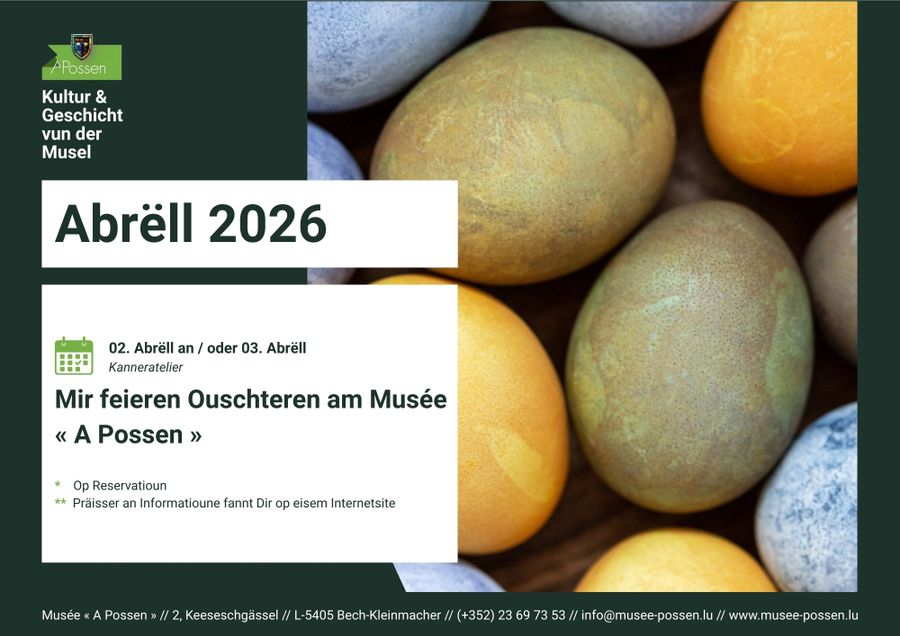 Reservation required by phone at +352 23 69 73 53 or by email at info@musee-possen.lu