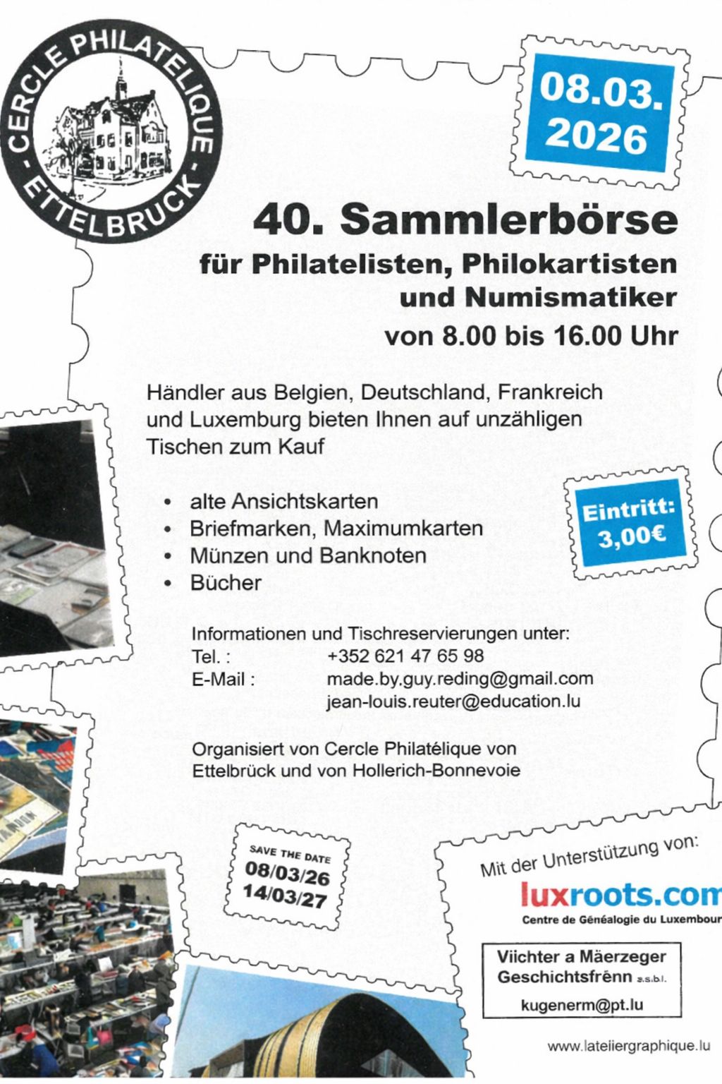 When? Sunday 08.03.202608:00 - 16:00 Collectors' Fair Where? 6, rue du Deich, L-9012 ETTELBRUCK Markets Collectors' FairLargest Luxembourg Collectors' Fair for Stamps, Post Cards, Banknotes, etc..©echo.luNext eventsSunday 08.03.202608:00 - 16:00