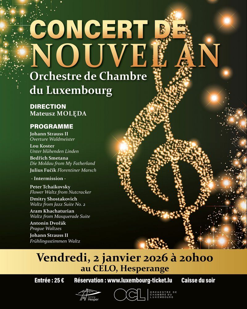 When? Friday 02.01.202620:00 Concert Nouvel An Where? 476, route de Thionville, L-5886 HESPERANGE Music Festivals Orchestre de Chambre du LuxembourgPrice informationmin.1.50€Bookmin.1.50€©echo.luNext eventsFriday 02.01.202620:00