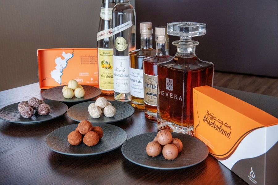 The renowned "Trüffen aus dem Miselerland" (truffles from the Moselle region), 5 chocolate balls, filled with a fine drop from each distillery that were created together with the Pâtisserie Hoffmann to celebrate the 10th anniversary of the Distillers' Day will go into production again this year and can be purchased from the distillers on site.
