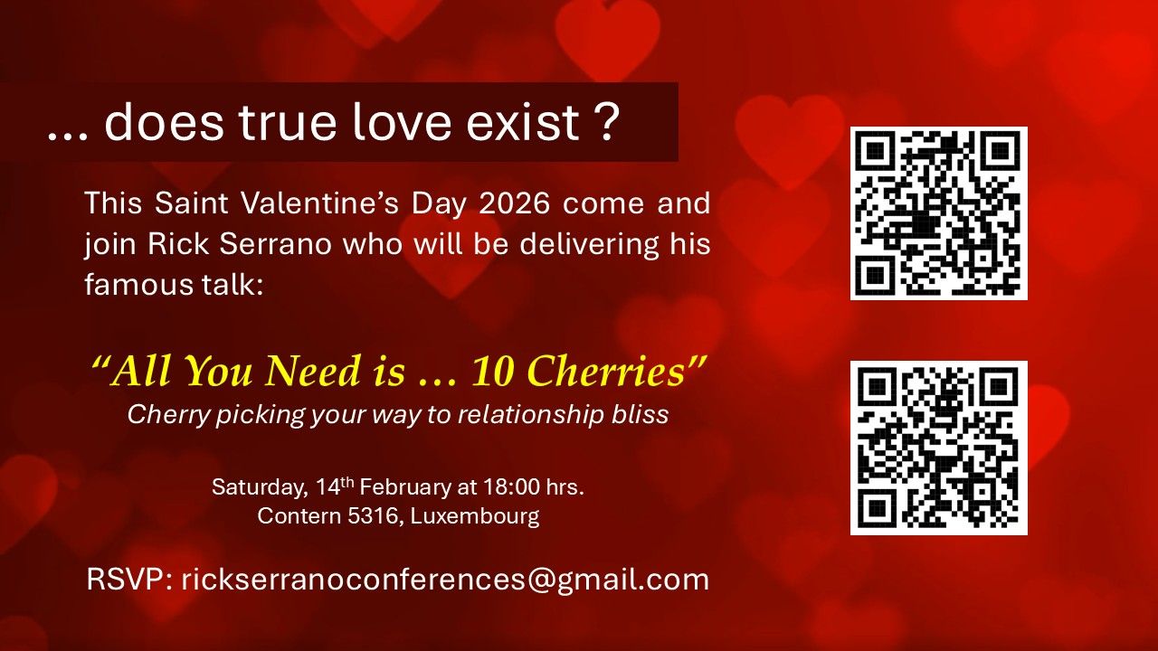 To celebrate this coming Valentine’s season, I will be delivering my well‑known talk “All You Need is 10 Cherries”., where I explain my theory and offer practical, concrete advice to support you in your search for love. I will hold the session at my place in Contern on Saturday, February 14th, 2026, at 6:00 PM.