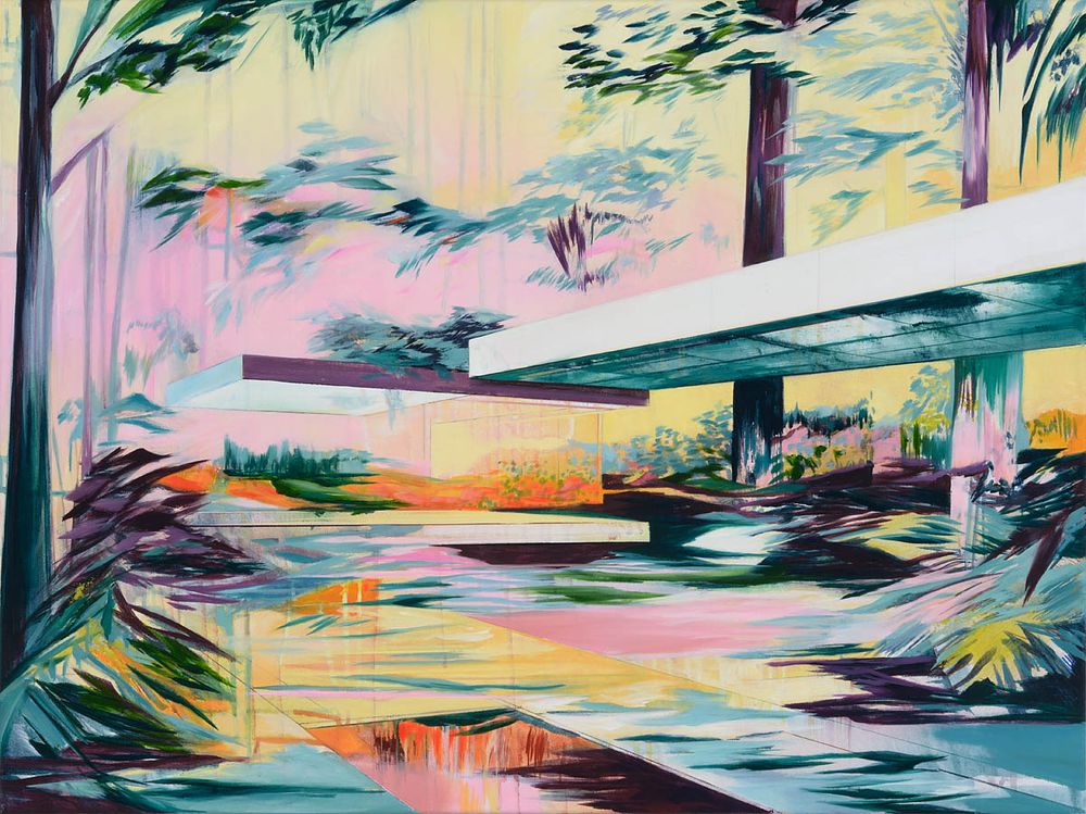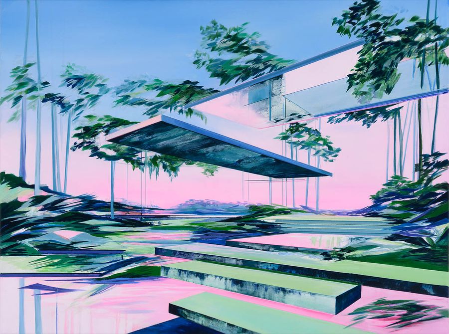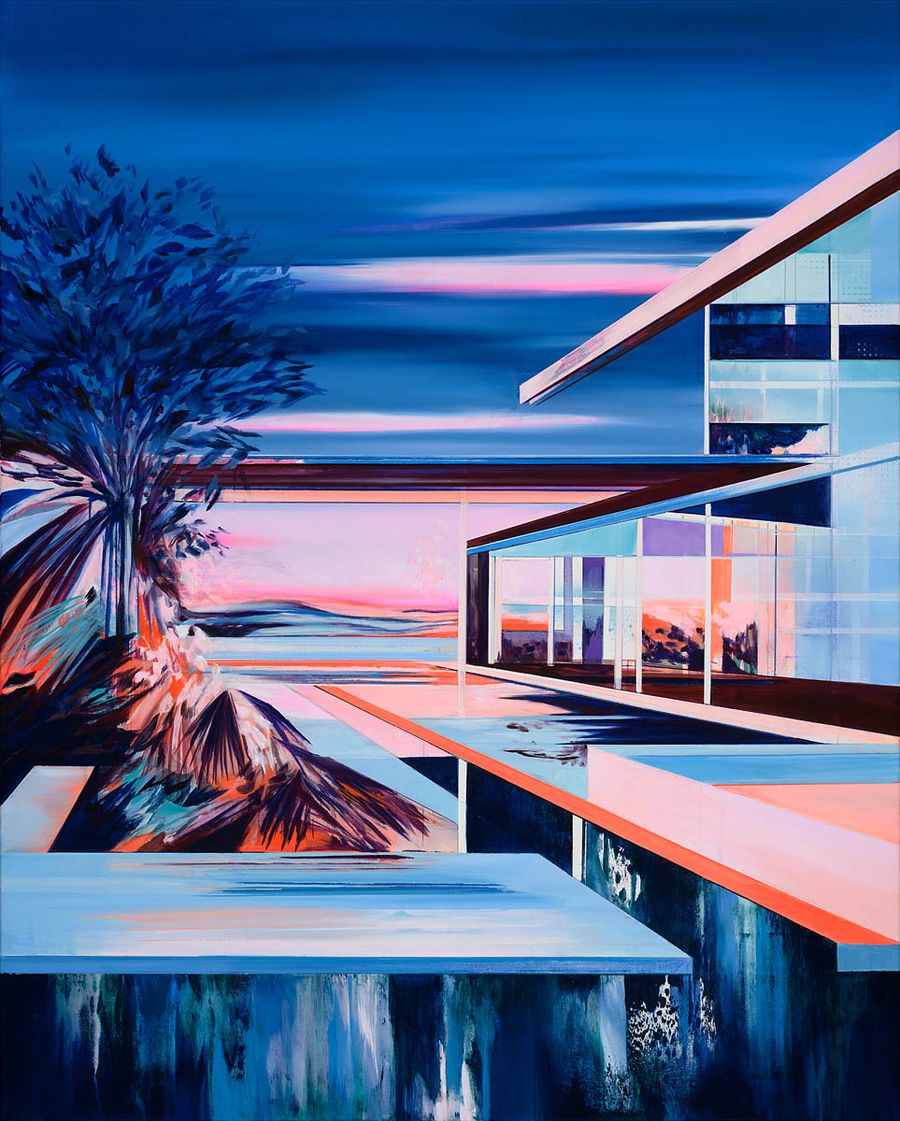 As a result, her architectural compositions appear deconstructed and abandoned, arousing a sense of curiosity and tension among viewers. 'I consider my works not only as representations, they are reflections on order and chaos, stability and change. They invite the viewer to question and rethink their perception of space and time, of existence and impermanence.' Her creative process starts with an intuitive arrangement of colours and forms, creating a balance between precision and lightness. The paintings, rendered in pastel tones, partly combined with vibrant neon colours, create a unique and distinctive visual atmosphere.