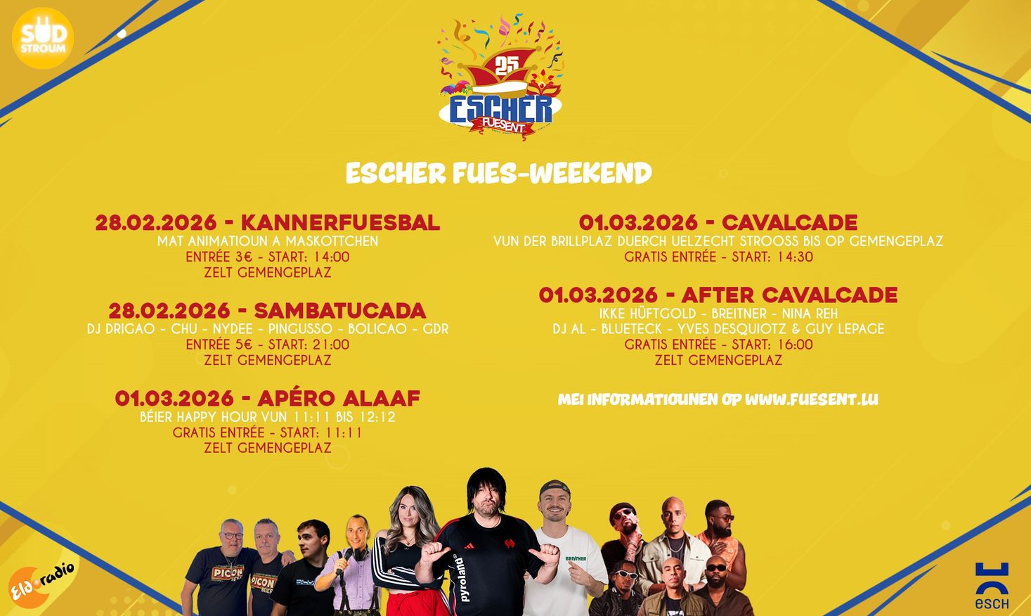 LU - D’Stroossen vun Esch sti vum 27. Februar bis den 1. Mäerz. am Zeeche vun der 25. Editioun vun der Escher Cavalcade 🎭! Dräi Deeg voller Faarwen, Musek a Laache fir Kleng a Grouss.
