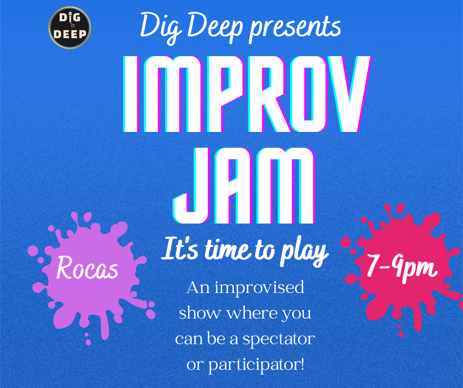Join us for a Dig Deep Improv Jam. An open mic show where you can get up on stage and perform OR simply sit back, relax and be entertained by amazing unscripted theatre!