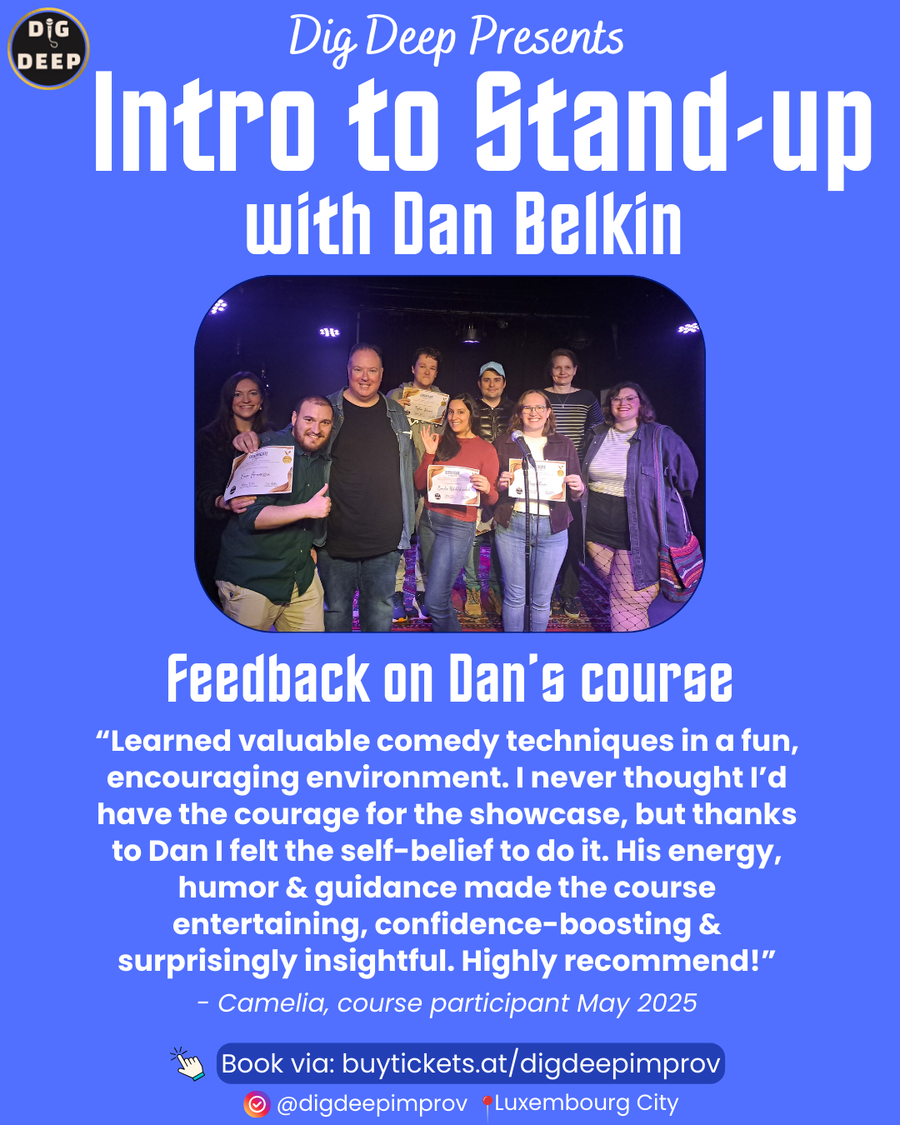 About Dan: Dan Belkin is a stand-up comedian, improvisor and performer who tours and produces his own shows all across Europe. Dan began his stand-up journey in Canada and is now based in Germany. He has been featured on Canada Laughs on Sirius XM, RTL TV, and has headlined the American Comedy Tour in Switzerland and played in multiple Fringe Festivals. In 2022 he hosted and produced 'Thick Plots' a storytelling competition series throughout Luxembourg and other European cities, as well as the comedy showcase night 'Room Noir'. In 2023 Dan Started touring with comedic advice show Fake Freuds, and has toured the show in over 30 cities with sold out shows in many cities including Brussels, Antwerp, Rotterdam, Amsterdam, Berlin, Frankfurt, Munich, Hamburg, Vienna, Prague ,Luxembourg, Zurich, Geneva and more! He is also a founding member of the Luxembourg-based Improv troupe Garage Gang. Catch Dan's next stand-up gigs here or follow him on Instagram