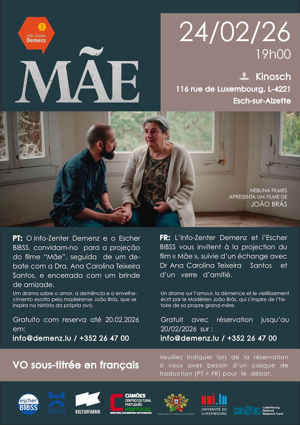 The Info-Zenter Demenz and the Escher BiBSS invite you to the screening of the film "Mãe" followed by a discussion with Dr. Ana Carolina Teixeira Santos and a friendly drink.