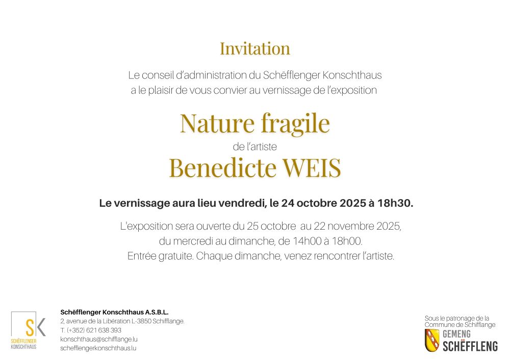 The Schëfflenger Konschthaus is delighted to invite you to the opening of the retrospective ‘Nature fragile’ by Benedicte Weis, an artist who sensitively celebrates the beauty and vulnerability of life through her paintings and sculptures.