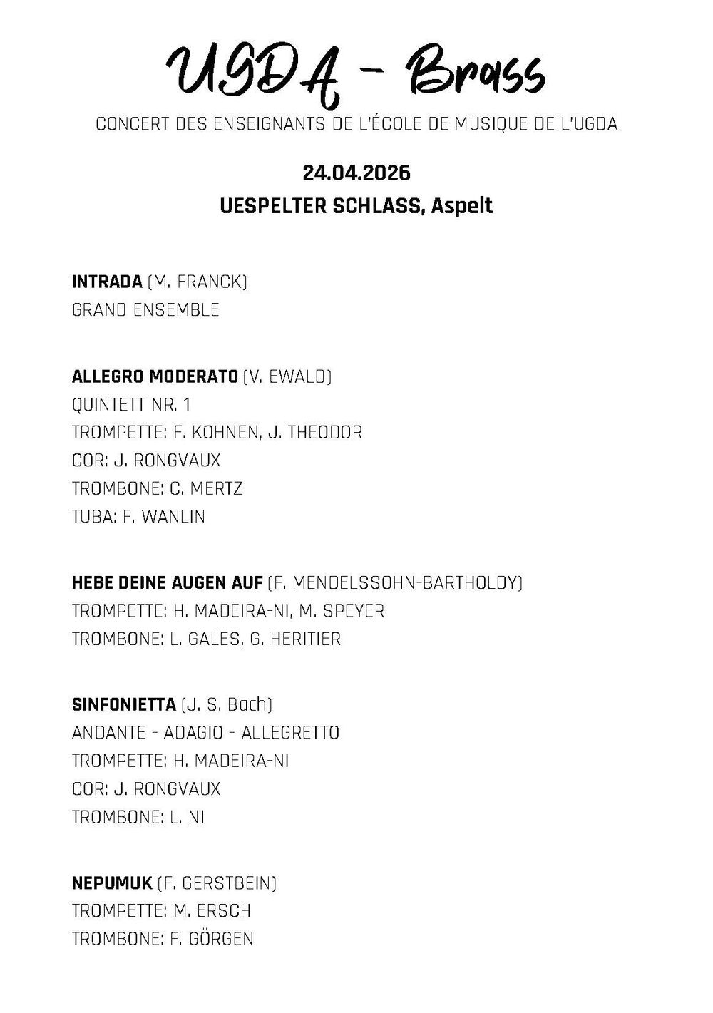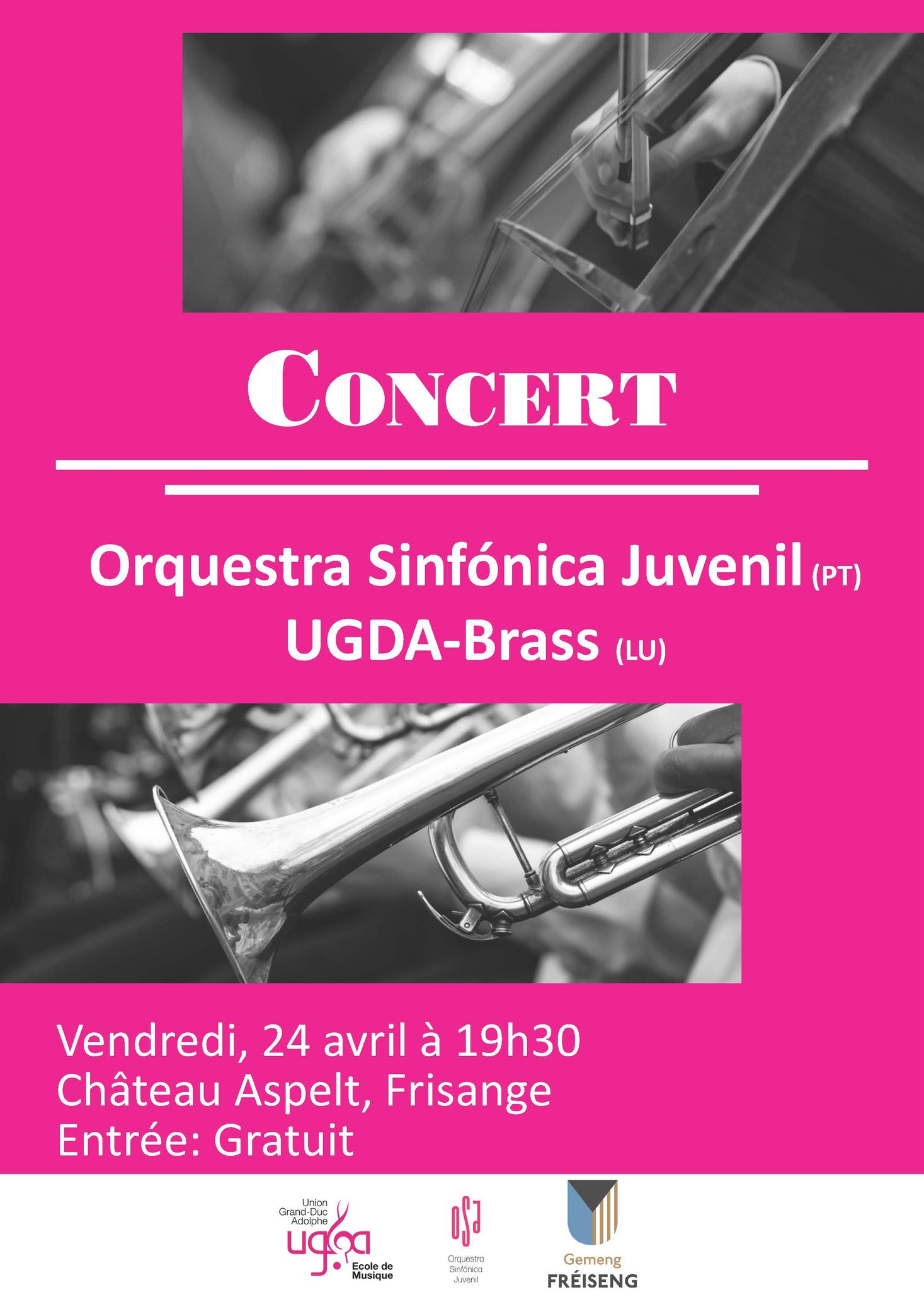 When? Friday 24.04.202619:30 - 21:30 Orquestra Sinfónica Juvenil (PT) Where? 37, Rue Pierre d'Aspelt, L-5710 ASPELT Music Festivals UGDA-Brass (LU)Concert classique Orquestra Sinfónica Juvenil (PT).UGDA-Brass (LU).©echo.luNext eventsFriday 24.04.202619:30 - 21:30