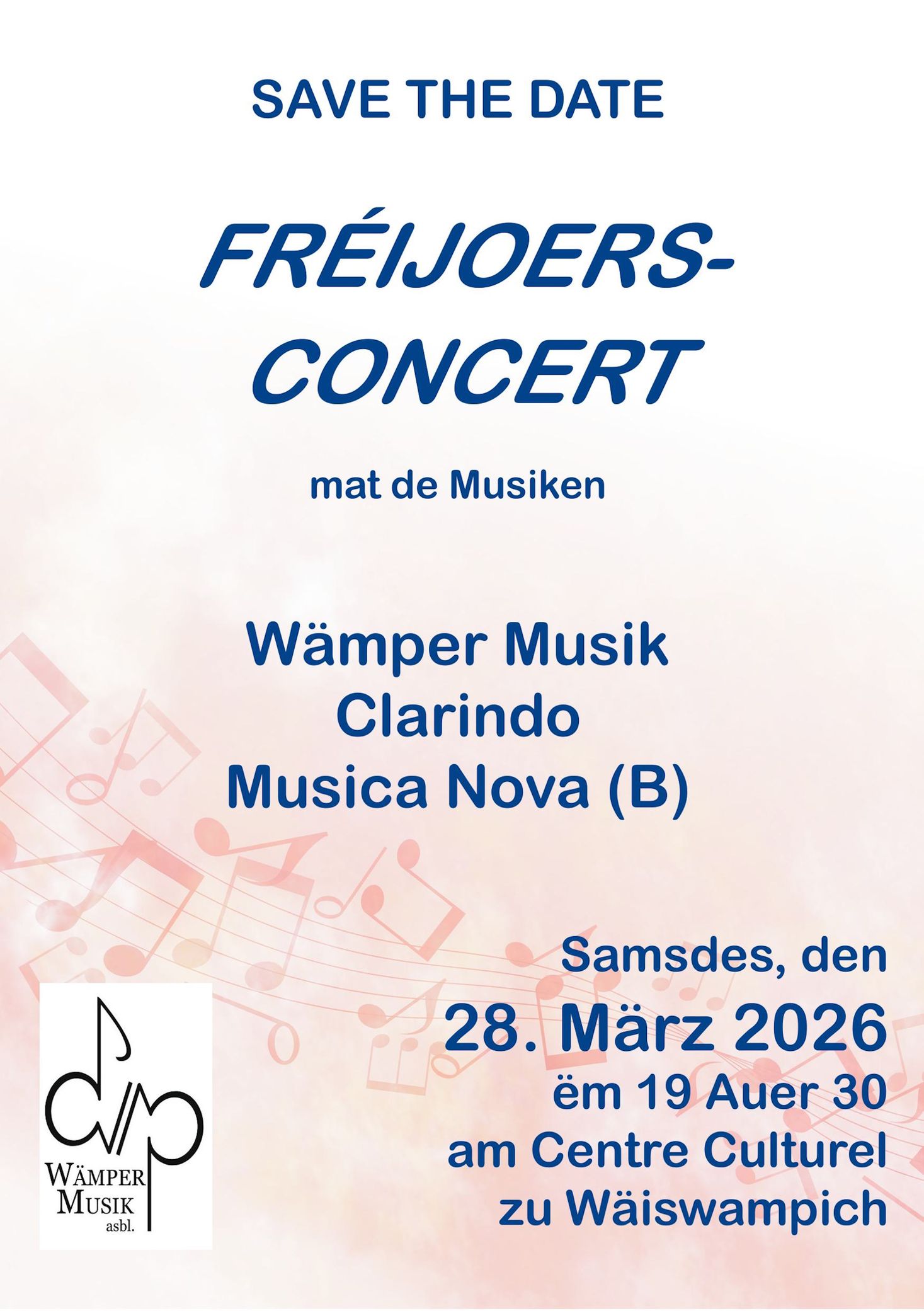 When? Saturday 28.03.202619:30 - 23:45 spring concert Where? 9, Schullweeg, L-9990 WEISWAMPACH Music Festivals spring concert.spring concert.©echo.luNext eventsSaturday 28.03.202619:30 - 23:45