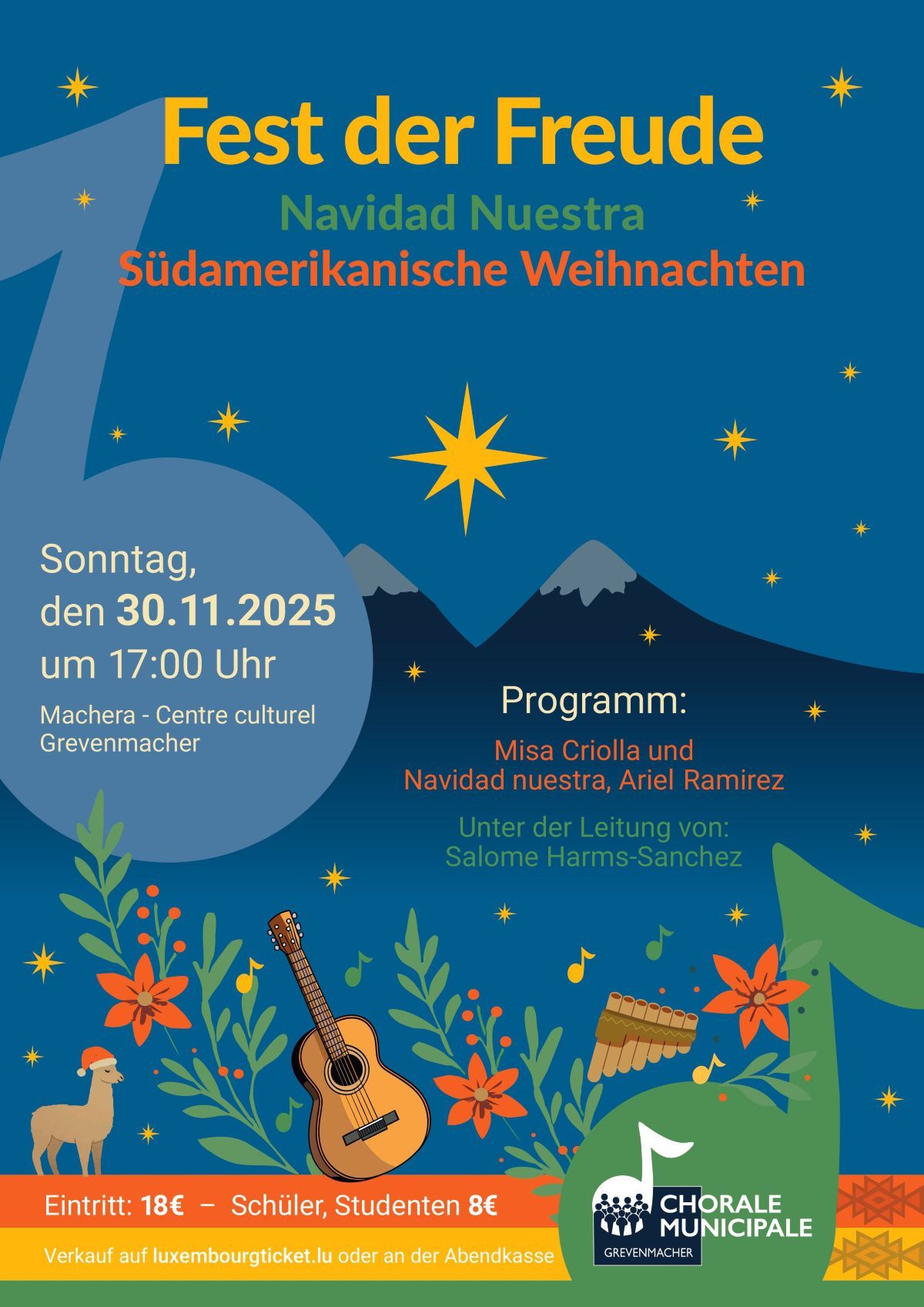 When? Sunday 30.11.202517:00 Südamerikanische Weihnachten Where? 1, Place du Marché aux Bestiaux, L-6731 Grevenmacher Music Festivals Concert de fin d'année avec la Chorale municipale de GrevenmacherPrice informationmin.8.00€Bookmin.8.00€©echo.luNext eventsSunday 30.11.202517:00