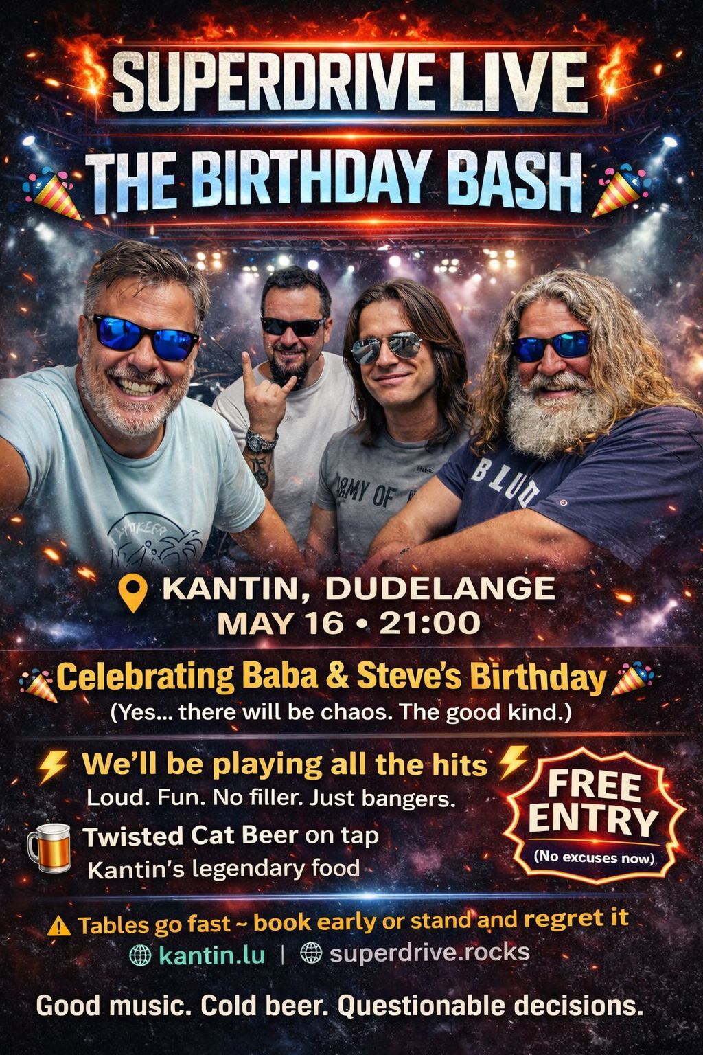 SUPERDRIVE is taking over the Kantin in Dudelange for a very special night — it's birthday season for Steve and Baba, and we're throwing a proper party. Expect a full live set, loud guitars, and the kind of energy only a birthday bash can bring.