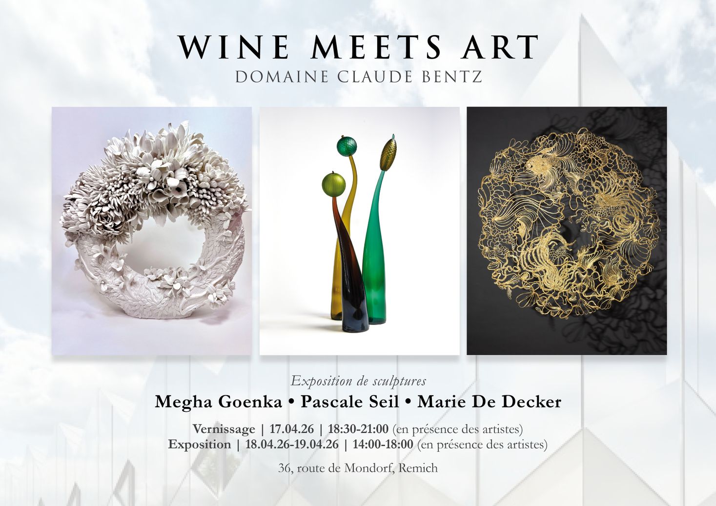 The works of Marie De Decker, Megha Goenka, and Pascale Seil engage in a dialogue with the history and architecture of the Domaine Claude Bentz.. Through recycled glass, gold, organic forms, and hand-crafted materials, the exhibition highlights a unique encounter between four women—coming from the worlds of viticulture and art—a historically rich location, and a shared goal: to root creation in time while giving a contemporary resonance to heritage.