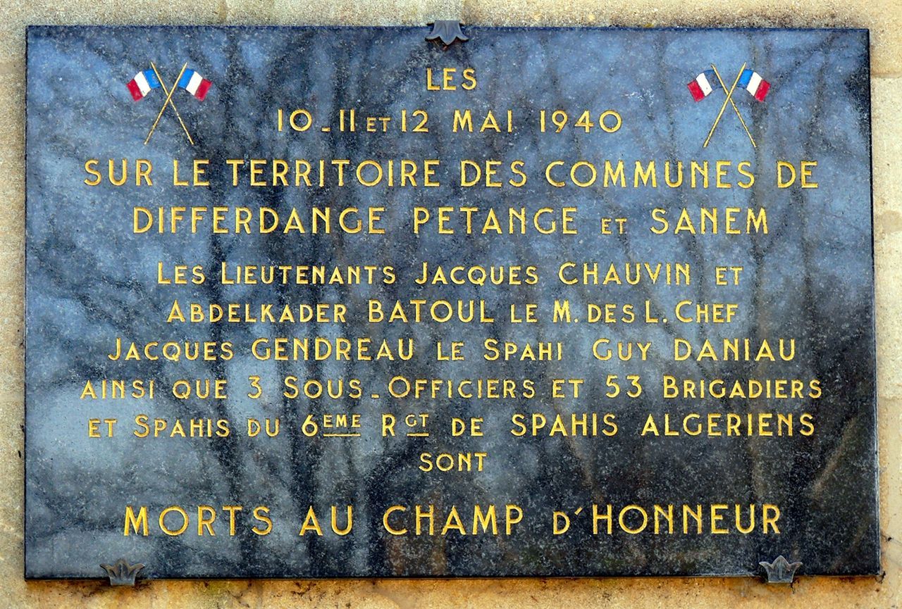 Lorsque le Reich allemand envahit le Grand-Duché de Luxembourg en mai 1940 afin de pouvoir progresser davantage en France et en Belgique, la région de Minett fut occupée par les unités mobiles françaises. Il y a eu des escarmouches et des combats occasionnels. Au total, 59 militaires du 6e Régiment du SpaHis algérien, troupe légère d'éclaireurs, ont été tués dans la région de Pétange, Differdange et Lasauvage. Cette plaque commémore leurs victimes. Une autre plaque commémore également les victimes parmi la population civile qui ont dû payer de leur vie pour avoir aidé à résister aux occupants.