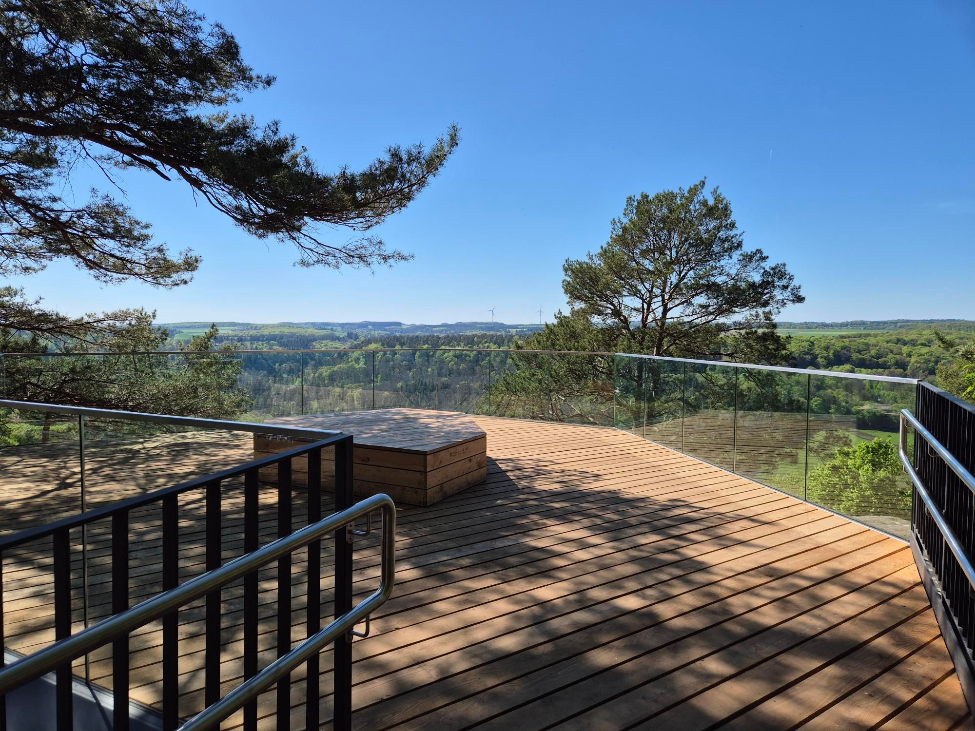 Accessible pour tous et construite en 2025 en acier et en bois régional, la plateforme a été conçue pour préserver au mieux le sol sensible en grès. Les visiteurs y profitent d’une vue impressionnante sur les vallées boisées et les formations rocheuses – un lieu calme où l’histoire géologique de la Région Mullerthal devient perceptible.