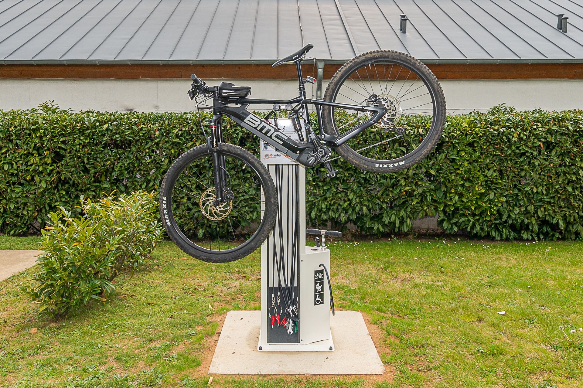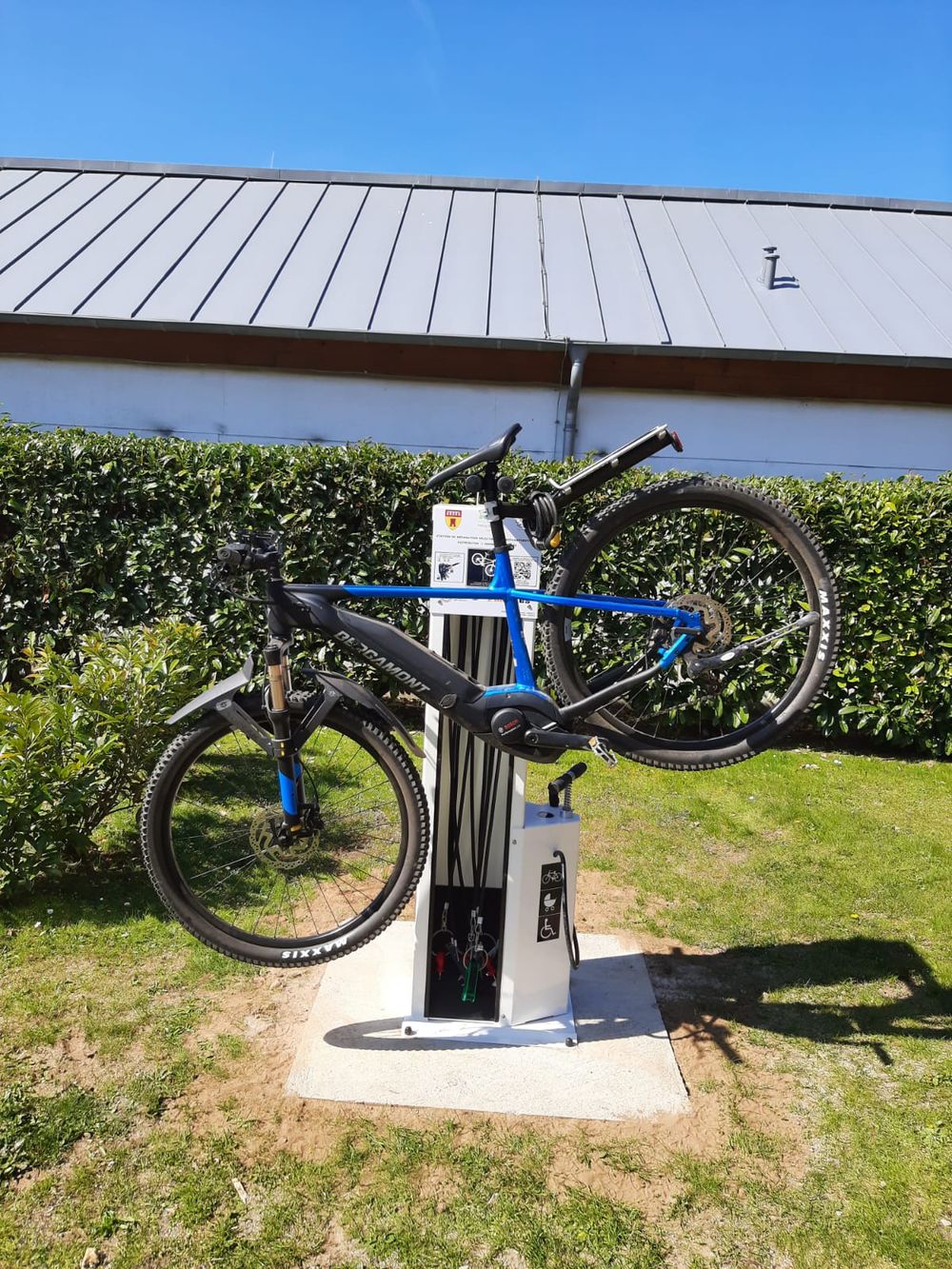 La station de réparation devant la piscine Aqua Park Beaufort propose des outils pour réparer les vélos ainsi qu'une pompe à air pour gonfler les roues comme les poussettes et les fauteuils