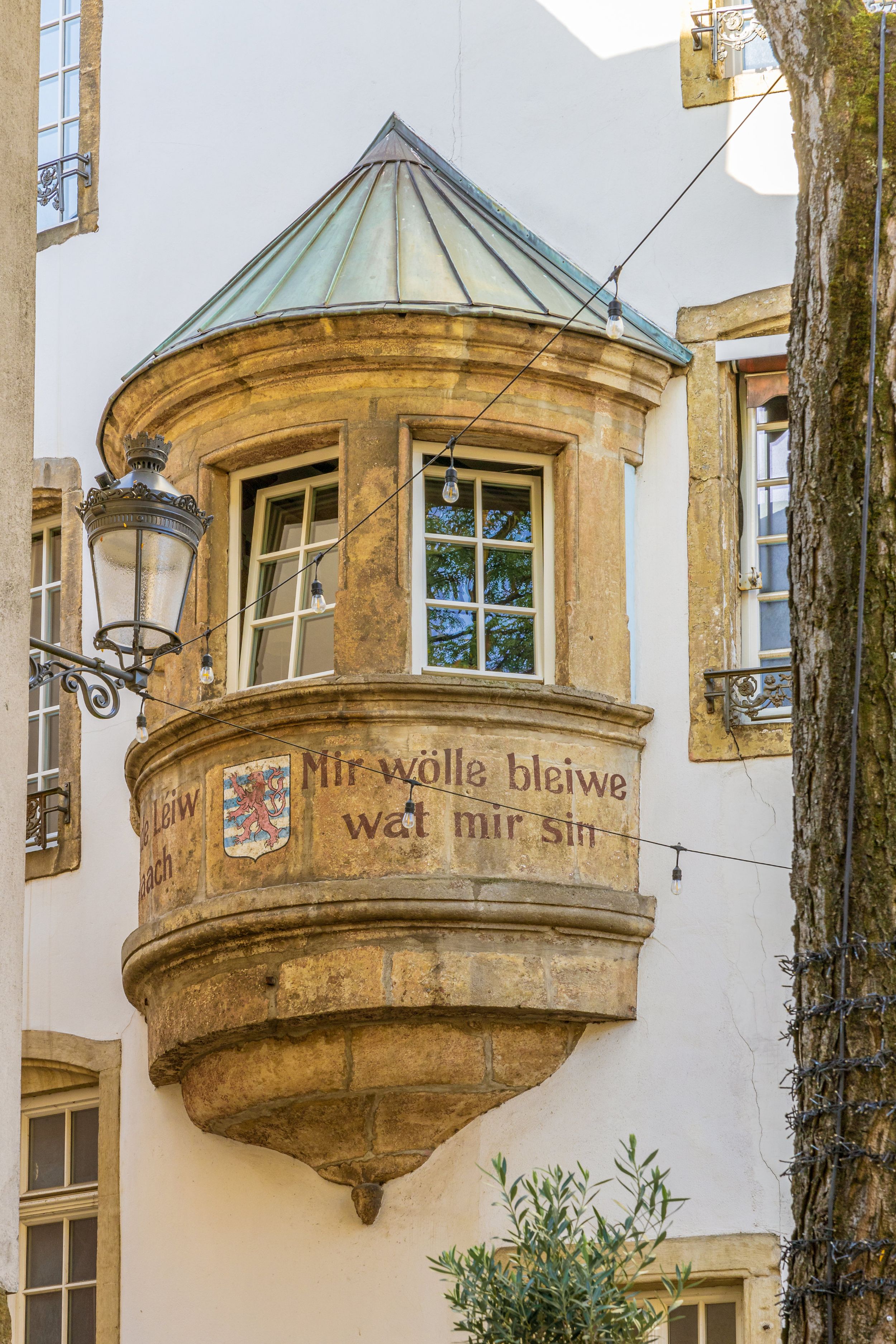 La volonté historique du peuple luxembourgeois de préserver son identité unique et sa souveraineté nationale a donné naissance à ce slogan inscrit sur la petite tour du restaurant Am Tiirmchen.