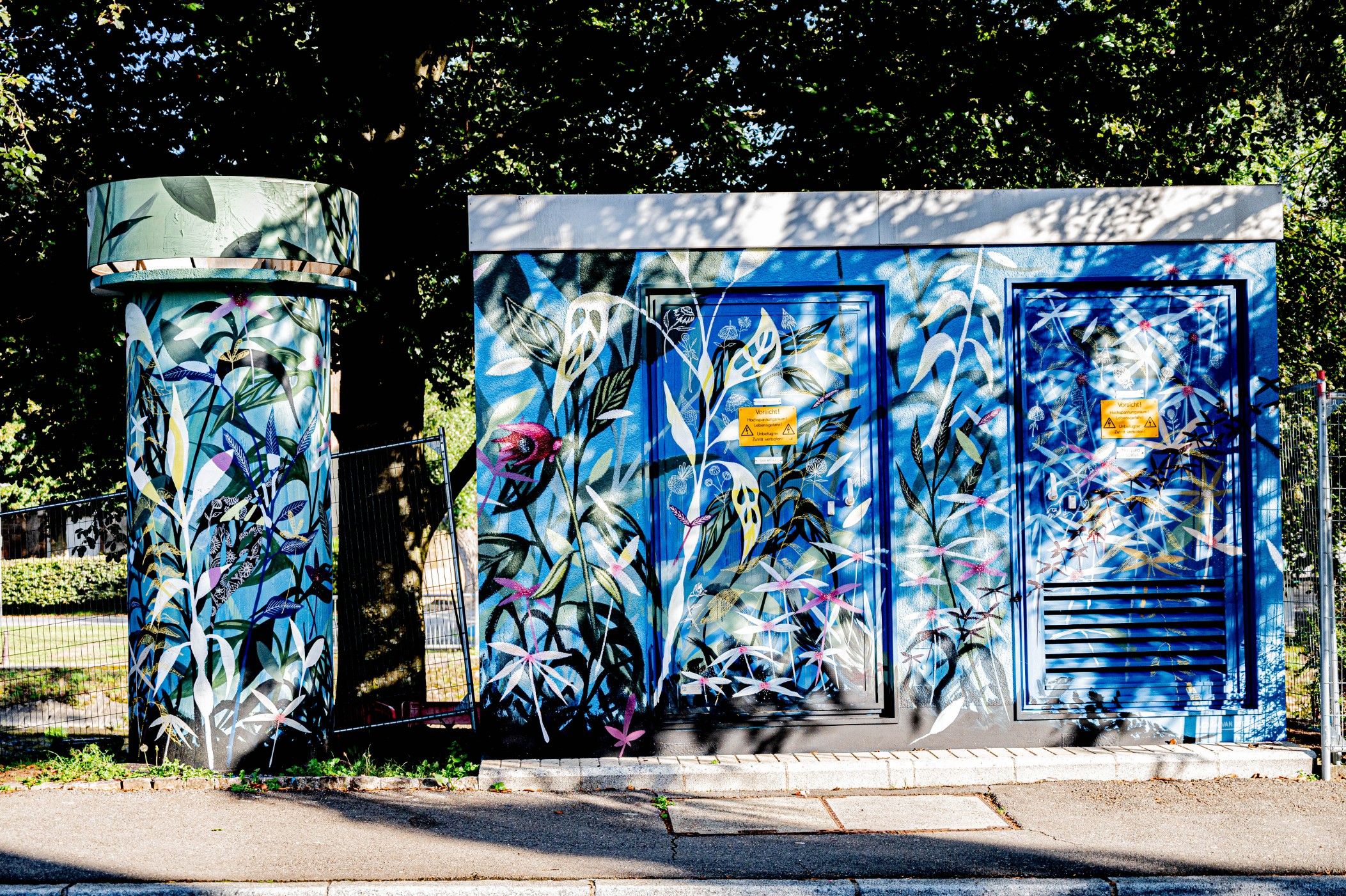 Un peu cachés dans le parc, on tombe sur un transformateur et une ancienne colonne Morris, embellis par Collin Van den Sluis en août 2023.