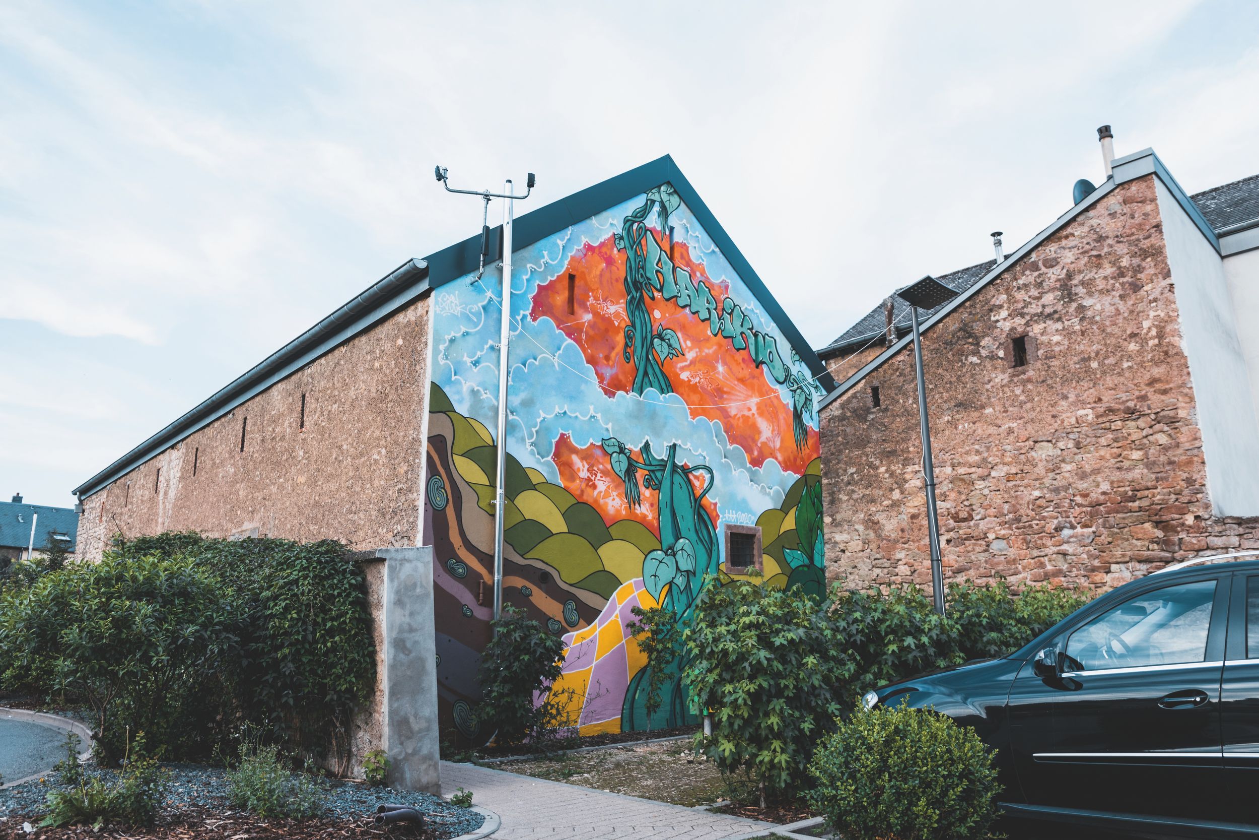 La deuxième œuvre d'art sur la place est un graffiti coloré de Stick, qui attire immédiatement le regard avec ses lianes vertes et son fond orange.